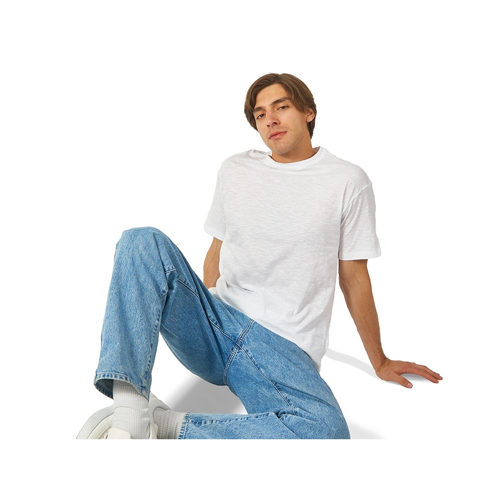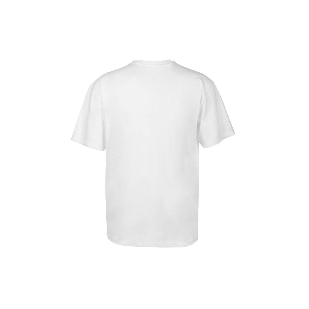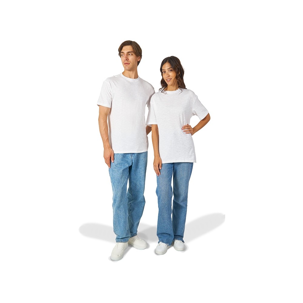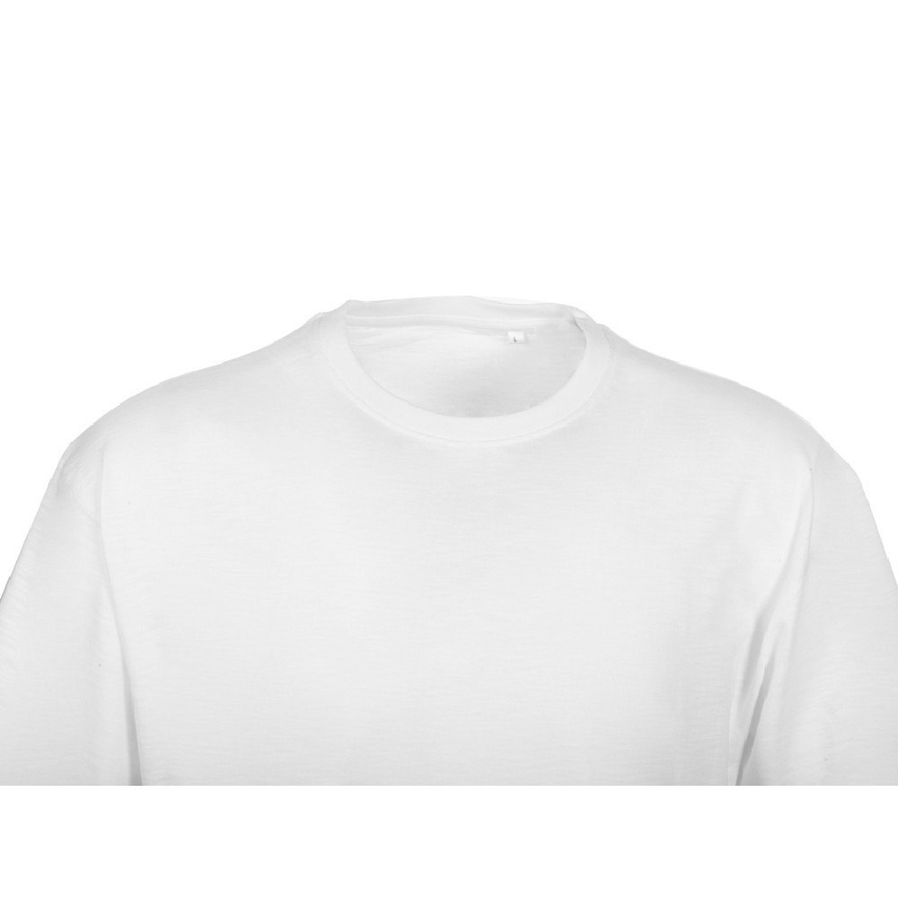 Полотно футболки имеет необычную структуру - с протяжками, но при этом гладкую поверхность, что обеспечивает идеальную поверхность для нанесения: прямая печать, трафаретная или термотрансфер прекрасно ложатся на такое полотно. Декоративная отстрочка по низу рукавов и изделия, а также отстрочка по горловине позволяют футболке дольше сохранять форму.