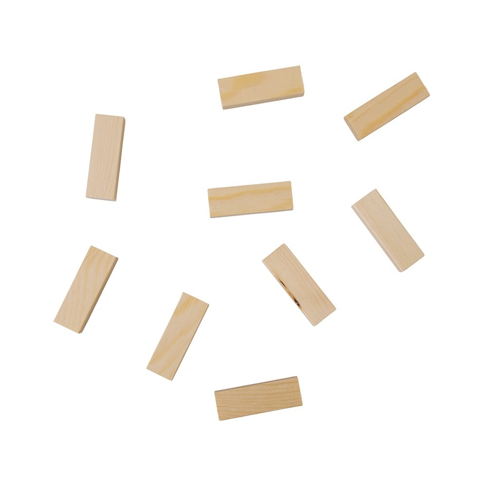 В комплекте — 54 бруска, изготовленных из натуральной сосны: лёгкие, прочные и приятные на ощупь. Все элементы аккуратно отшлифованы, что делает игру комфортной и безопасной даже для детей.