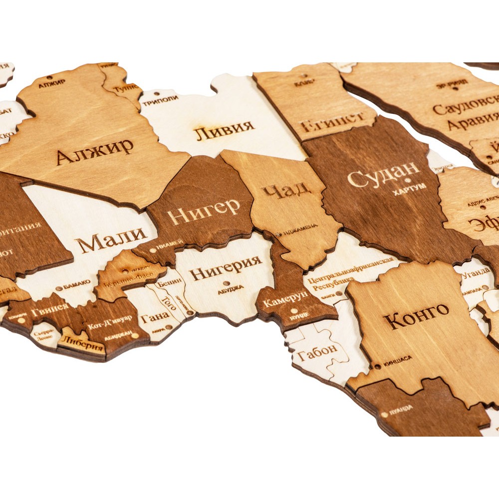 Настенная сборная карта мира из березовой фанеры — прекрасное украшение как офиса, так и квартиры. Карта крепится на стену при помощи двустороннего скотча, который уже прикреплен с тыльной стороны каждого элемента. А еще можно оживить карту корабликами и самолетами, которые тоже идут в комплекте, устремив их к тем странам, куда вы бы хотели полететь.