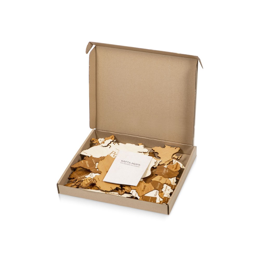 Комплектность элементы карты (материки,острова), декоративные элементы (самолетики,кораблики), инструкция, упаковочная коробка, деревянный шильд для персонализации
