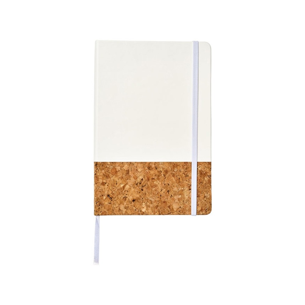 Блокнот Evora формата A5 из пробки и термополиуретана. Стильный блокнот формата A5 с твердой обложкой из искусственной кожи и пробки. Цветная эластичная застежка, лента-закладка, 80 листов линованной бумаги (80 г/м²) кремового цвета и расширяемый карман сзади для небольших заметок. Пробка и ПУ.