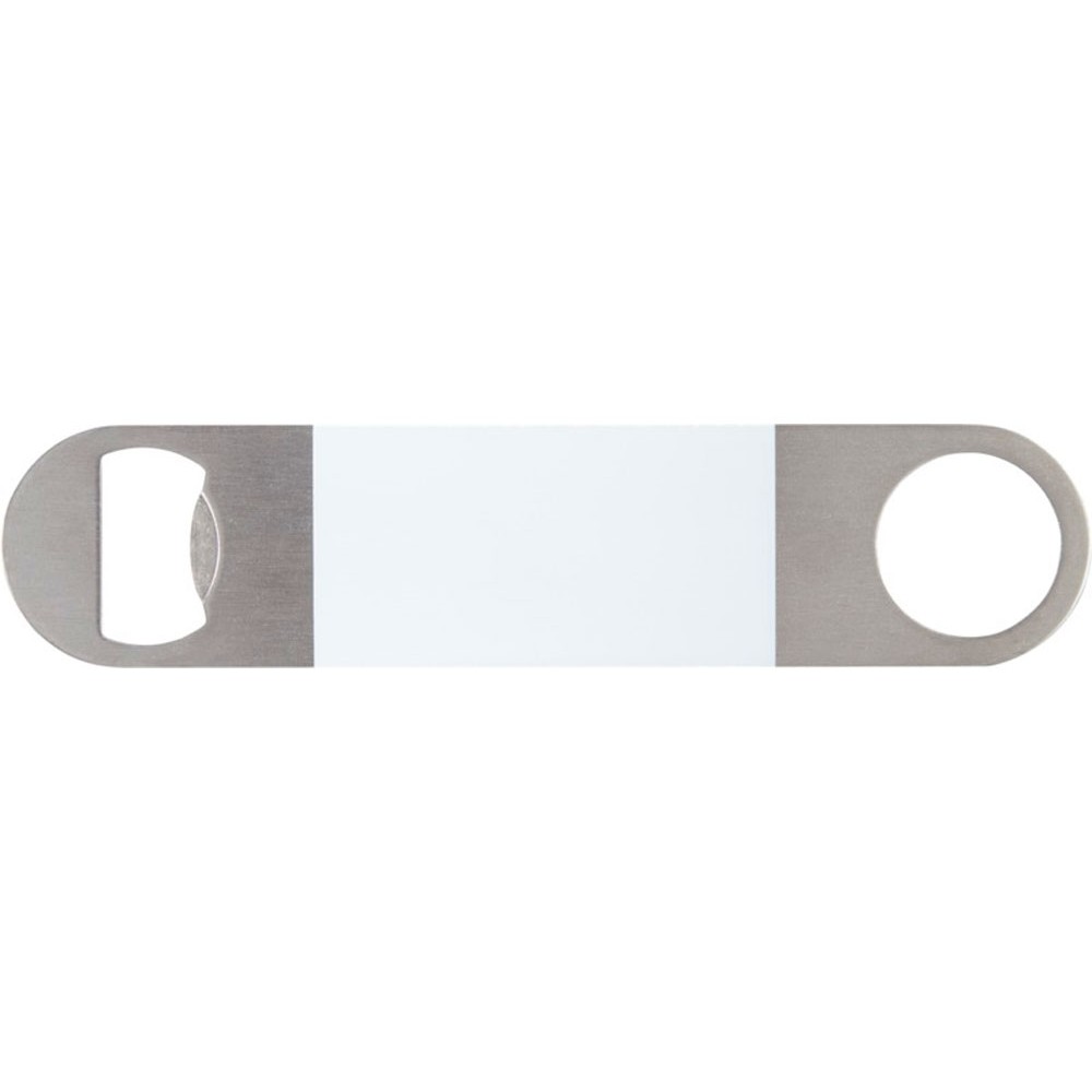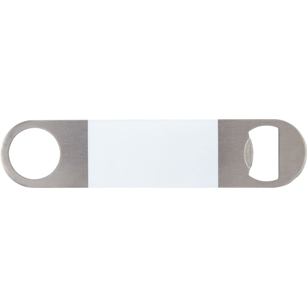 Открывалка для бутылок из нержавеющей стали с большой цветной областью в центре.