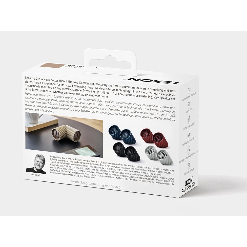 Ray Speaker — это дуэт магнитных Bluetooth®-колонок, удостоенных наград Red Dot Design Award и IF Design Award. Обеспечивая захватывающий стереозвук благодаря технологии True Wireless Stereo, эти колонки легко крепятся друг к другу или к любой магнитной поверхности, что делает их идеальными для использования дома или в дороге. Помимо прослушивания музыки, Ray Speaker позволяет совершать звонки без помощи рук и дистанционно делать селфи. Благодаря аккумулятору, работающему до 8 часов, и элегантному алюминиевому корпусу, они добавят современный штрих в ваш интерьер, а степень водонепроницаемости IPX4 позволяет использовать их на улице. Доступны различные цвета, которые дополнят ваш стиль.