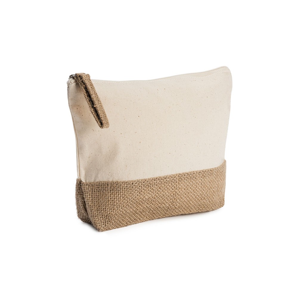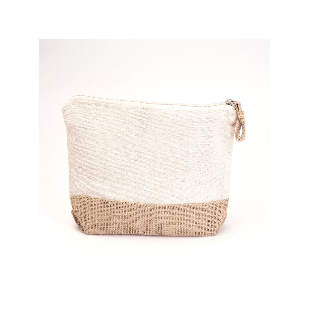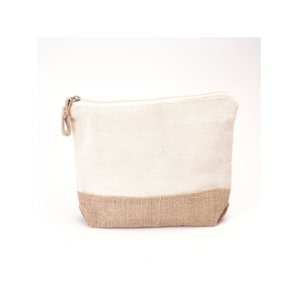 Эко-косметичка из хлопка и джута плотностью 180 г/м² натурального цвета с нижней частью и язычком из джута и застежкой-молнией в тон.