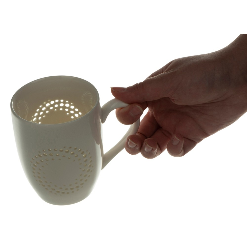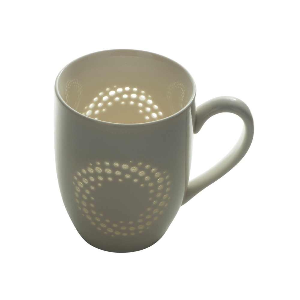 Эффектная особенность этой кружки - узор с эффектом “рисового зерна”, в котором отверстия в фарфоре заполнены прозрачной глазурью. Это уникальная древнекитайская техника, которая дает и кружке, и напитку буквально светиться изнутри.