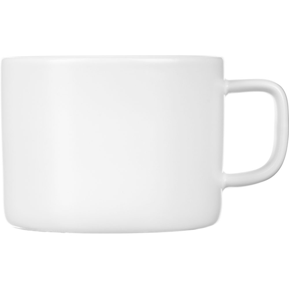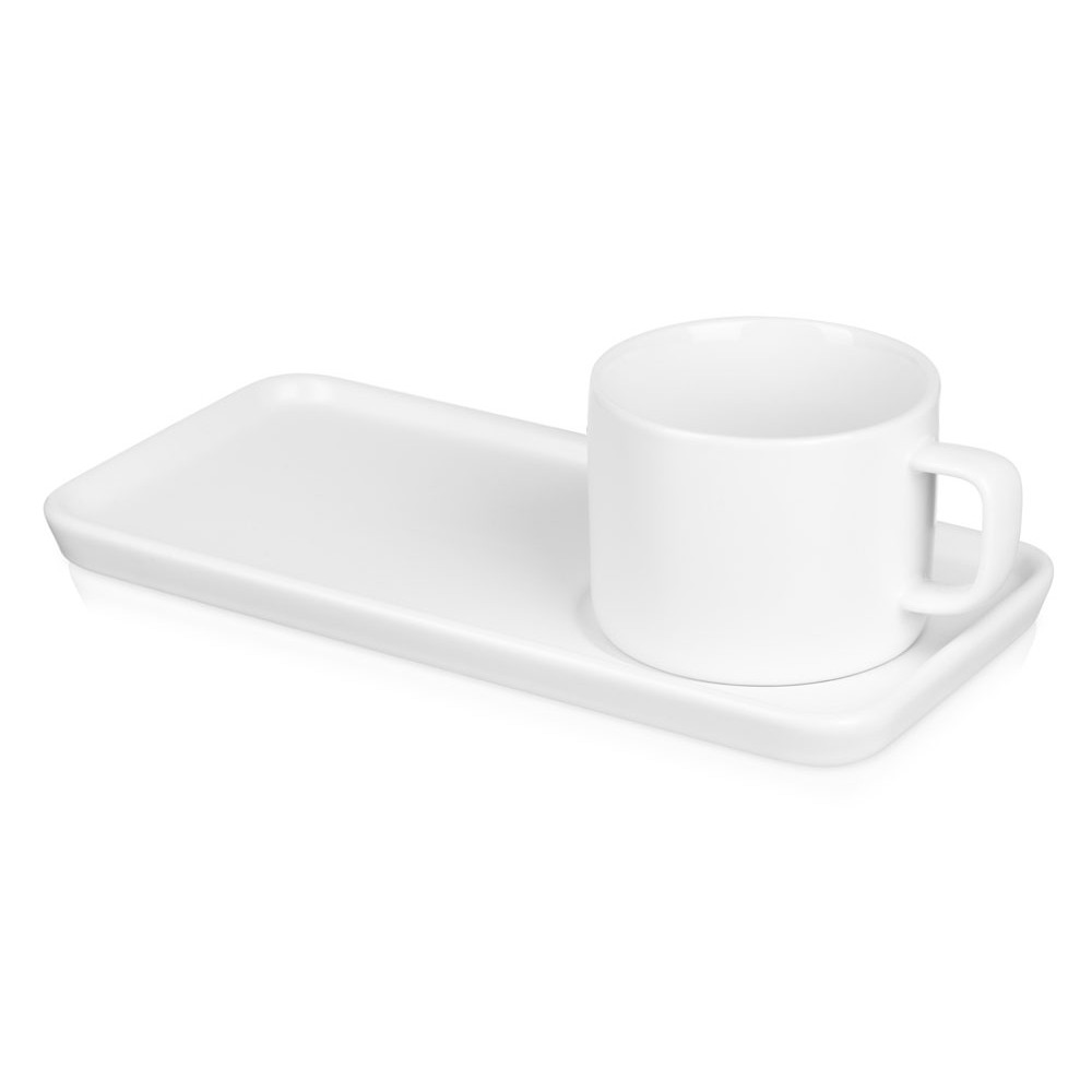 Чайная пара с необычным прямоугольным блюдцем — на нем хватит места не только для чашки, но и для пирожного. Весь силуэт этого комплекта — лаконичный, строгий, прямоугольный, что создает прекрасный фон для нанесения логотипа. Удобство этой чайной пары еще и в том, что для чашки предусмотрена отдельная ниша, которая не даст ей соскользнуть.