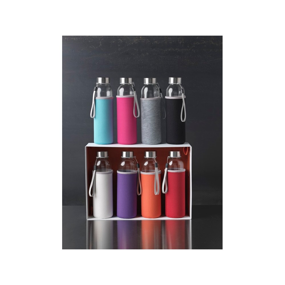 Стеклянная бутылка с одинарными стенками и съемной крышкой. На крышке есть ремешок для легкой переноски, кроме того имеется чехол из неопрена. Рекомендуется использовать для холодных напитков. Не замораживать, не разогревать в микроволновой печи. Объем 500 мл. Уложена в подарочную коробку.