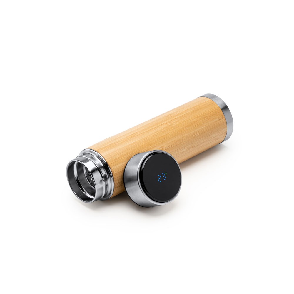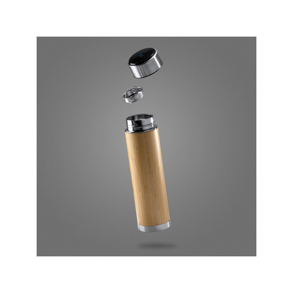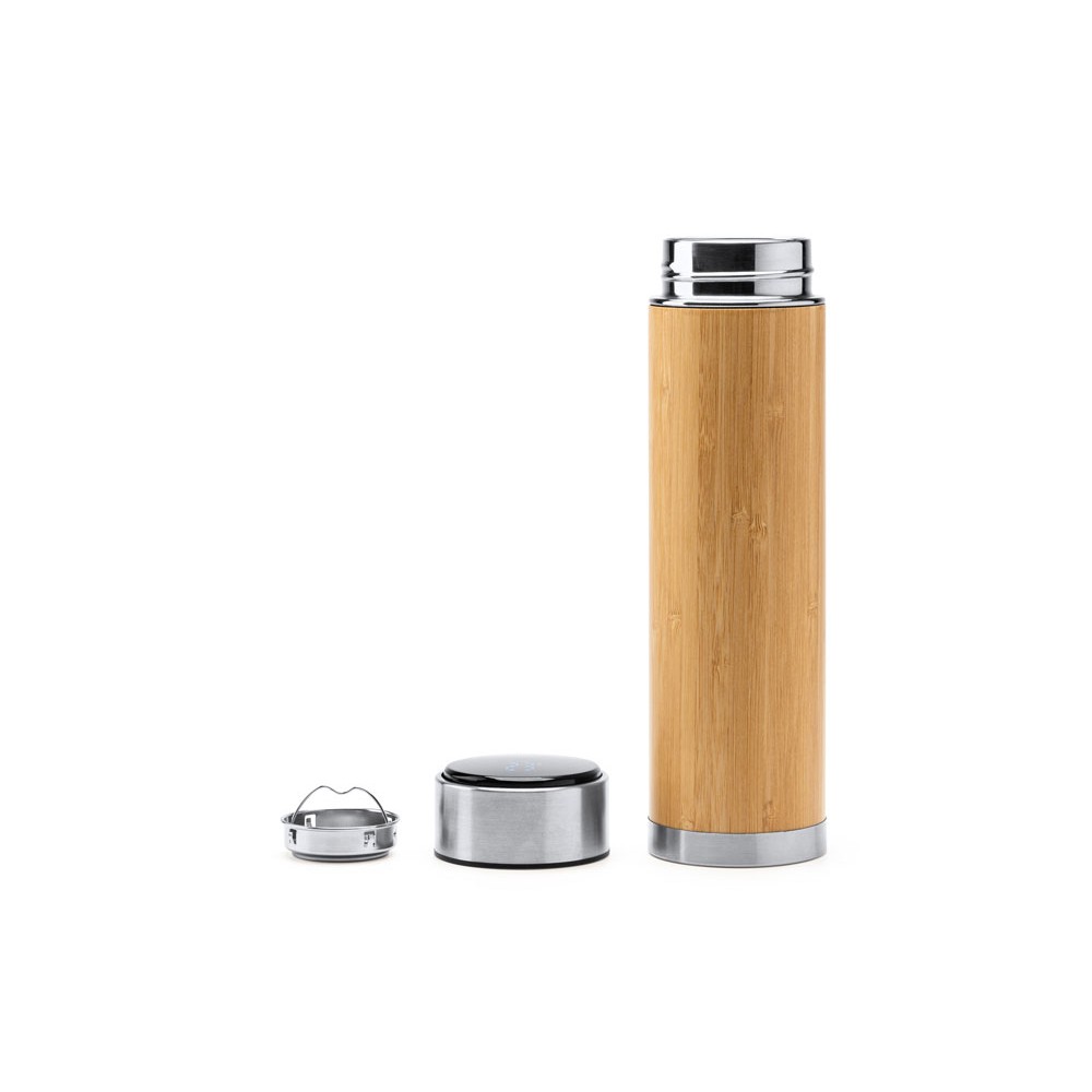 Термос с двойными стенками из нержавеющей стали 304 и бамбука с заварочным устройством. Цифровой сенсорный термометр на крышке, чтобы узнать температуру вашего напитка. Объем 480 мл.