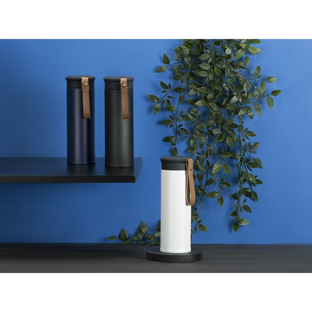 Термос герметично завинчивается на крышку, оснащенную съемным ремешком из качественной ПУ кожи. Крышка имеет прорезиненное покрытие, что создает интересное сочетание текстур в рамках одной модели. Корпус имеет элегантную рельефную поверхность с антискользящим эффектом.