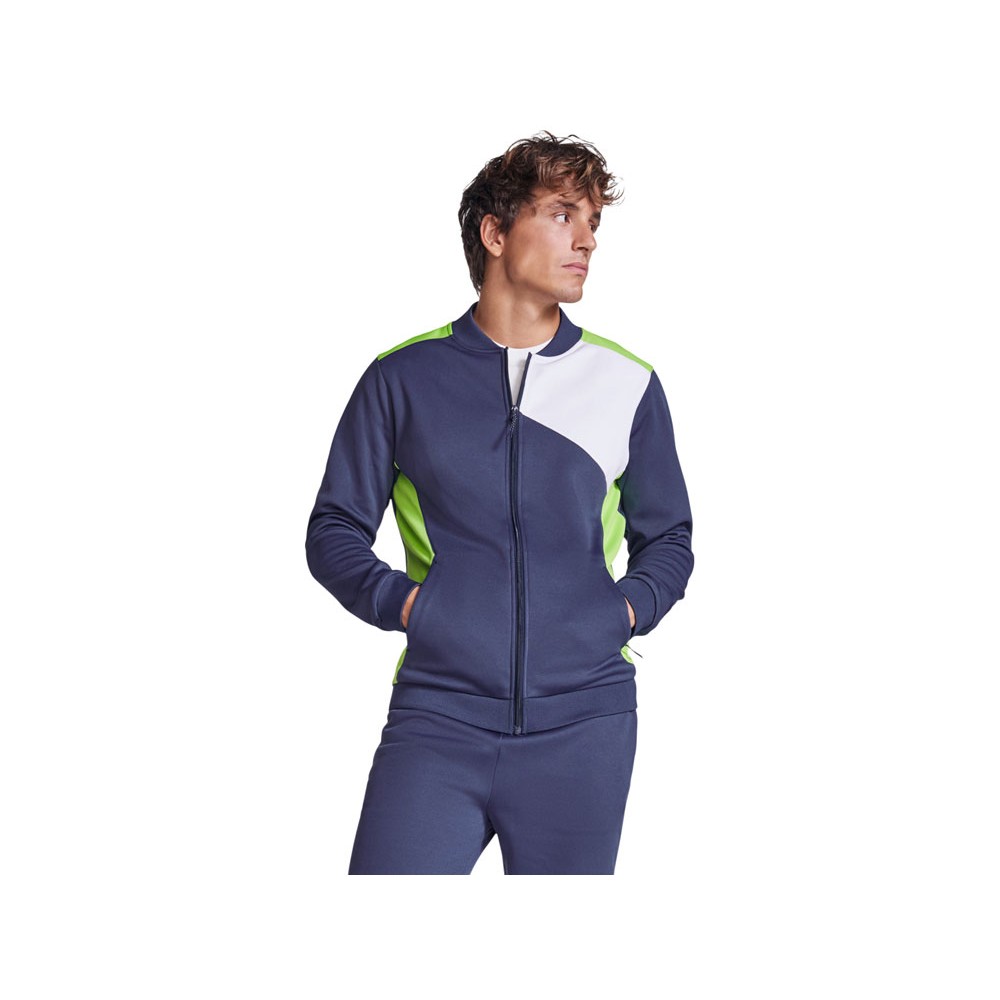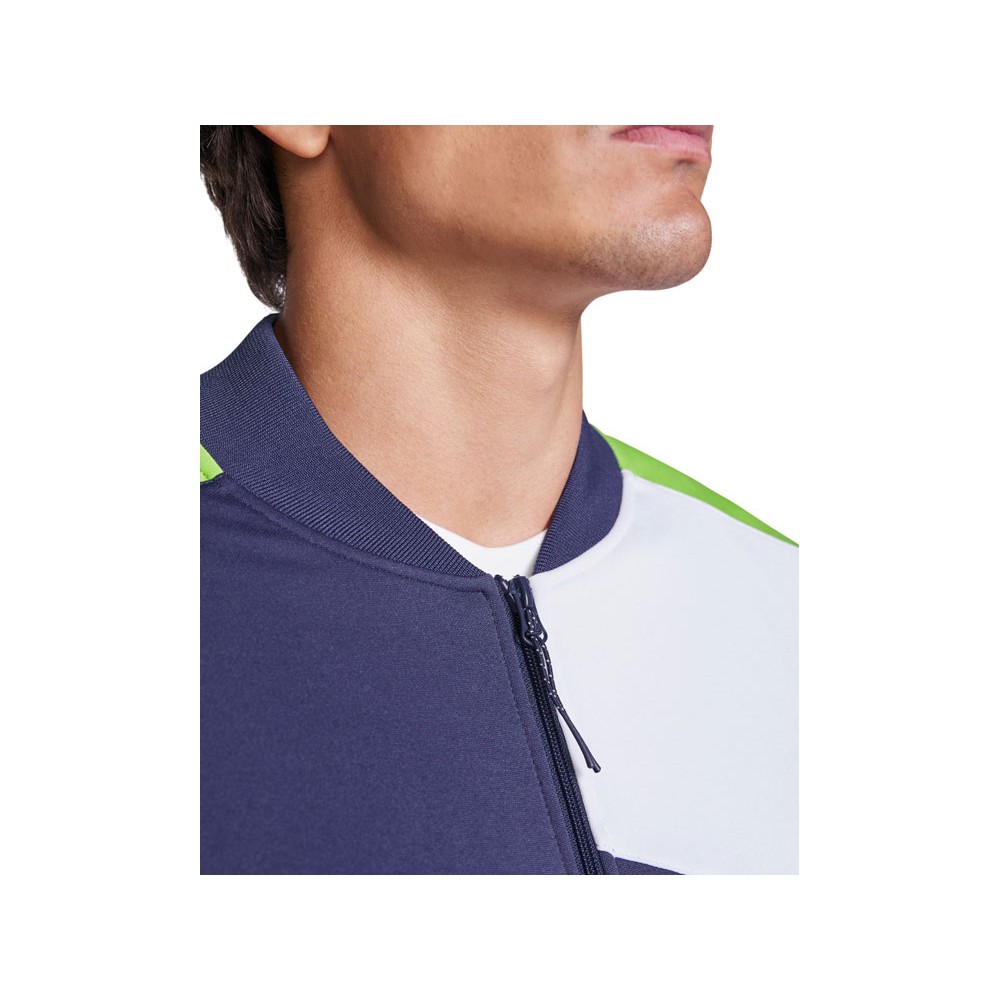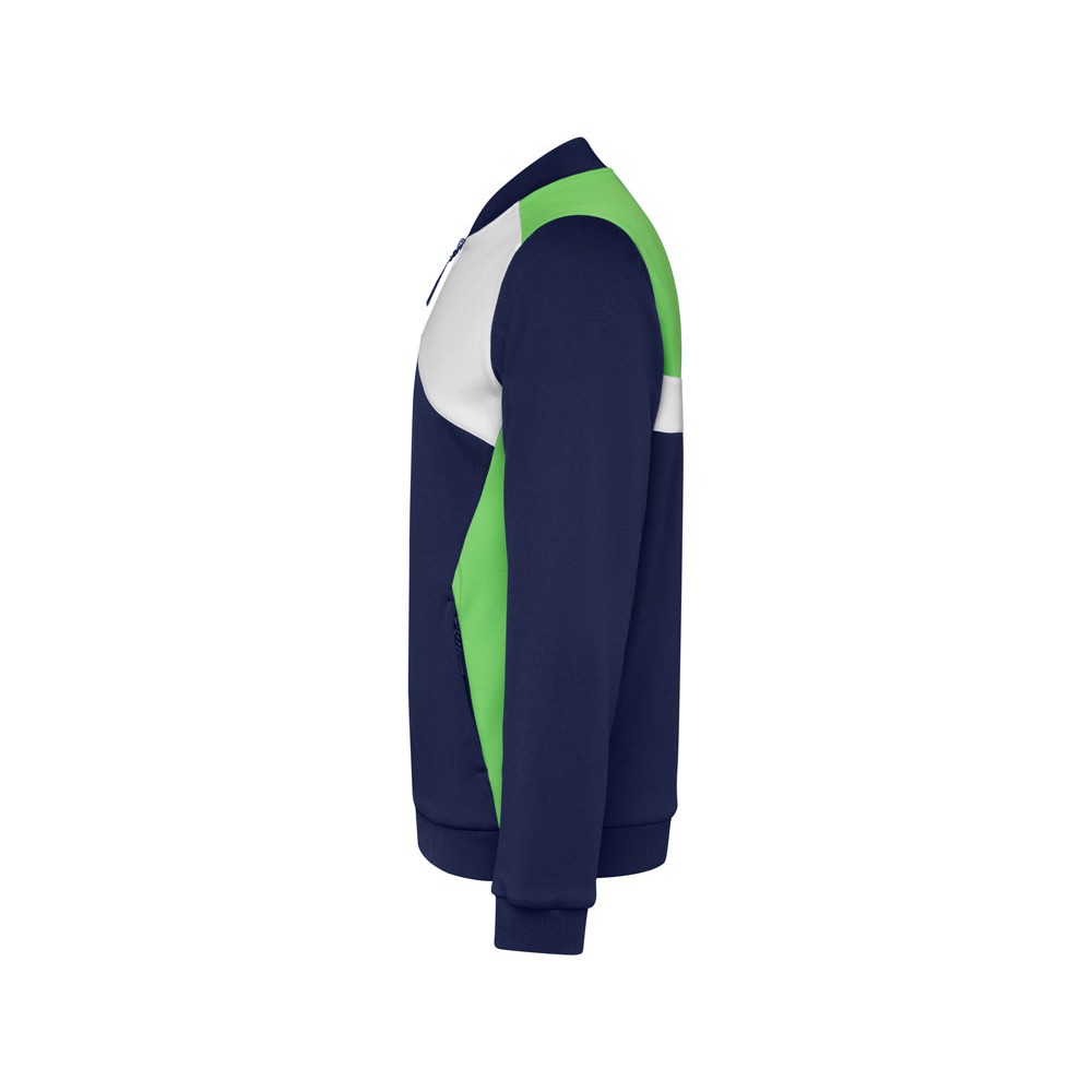Спортивная куртка на молнии. Боковые карманы закрываются на молнию. Воротник, манжеты и низ из риба 1х1. Ассиметричная левая сторона спроектирована специально для вышивки. Может быть с комбинирована с брюками Rhodes.