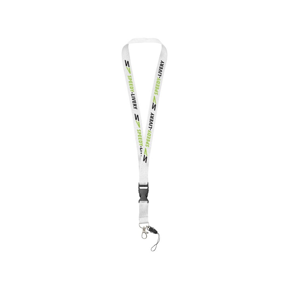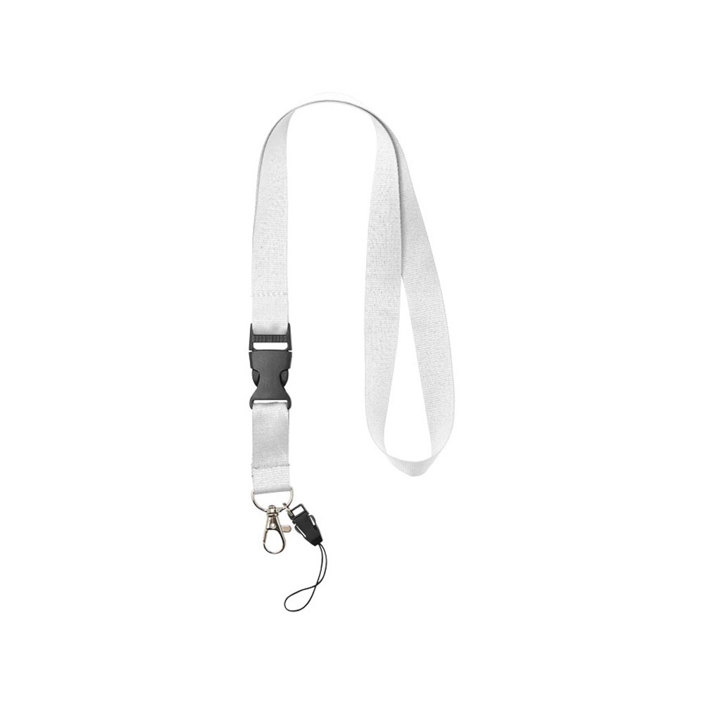 Многофункциональный шнурок с отстегивающейся пряжкой, овальным крючком с зажимом и держателем для телефона. Идеально подходит для бейджа, удостоверения личности или ключей. Предлагается широкий выбор цветов с большим участком для нанесения логотипа. Полиэстер.