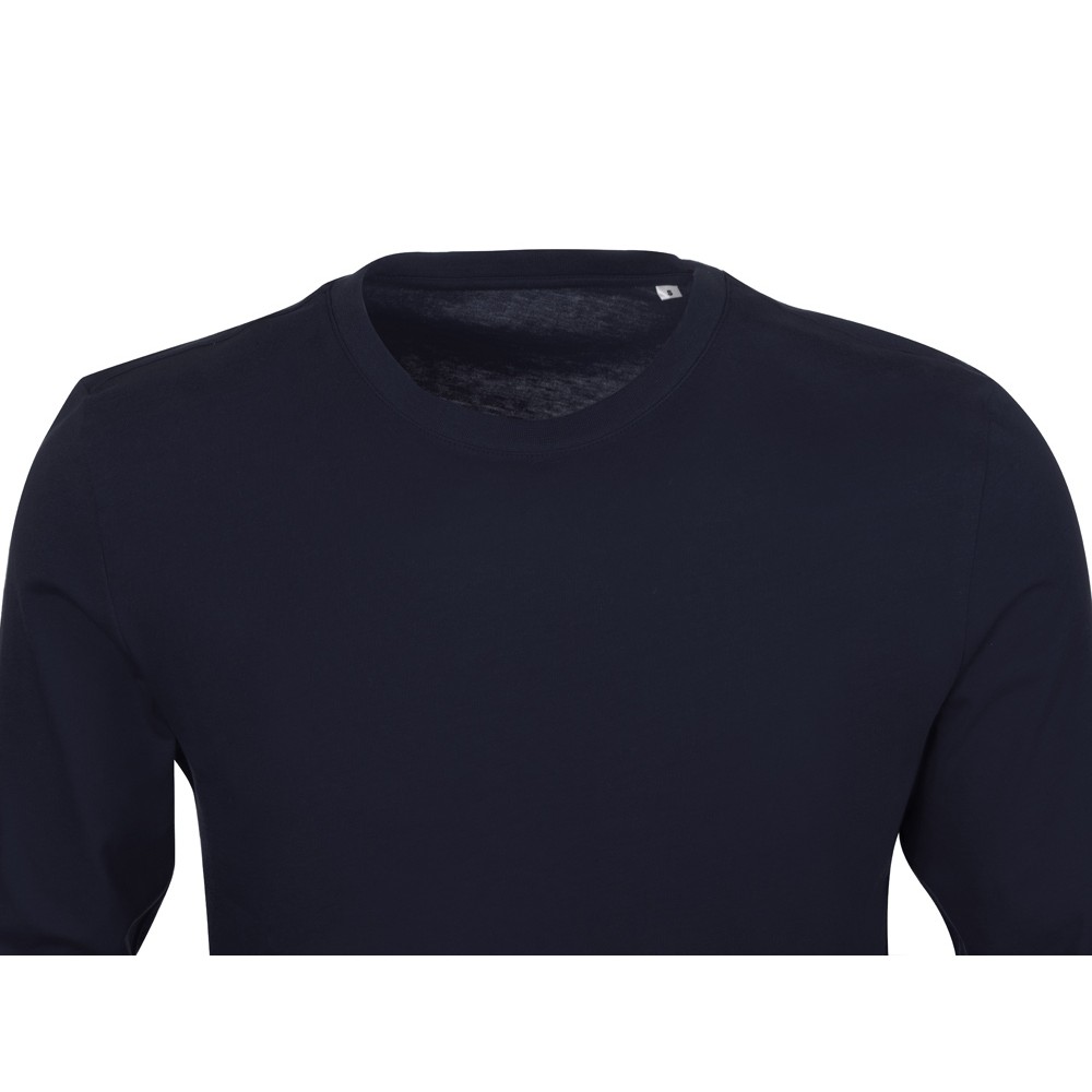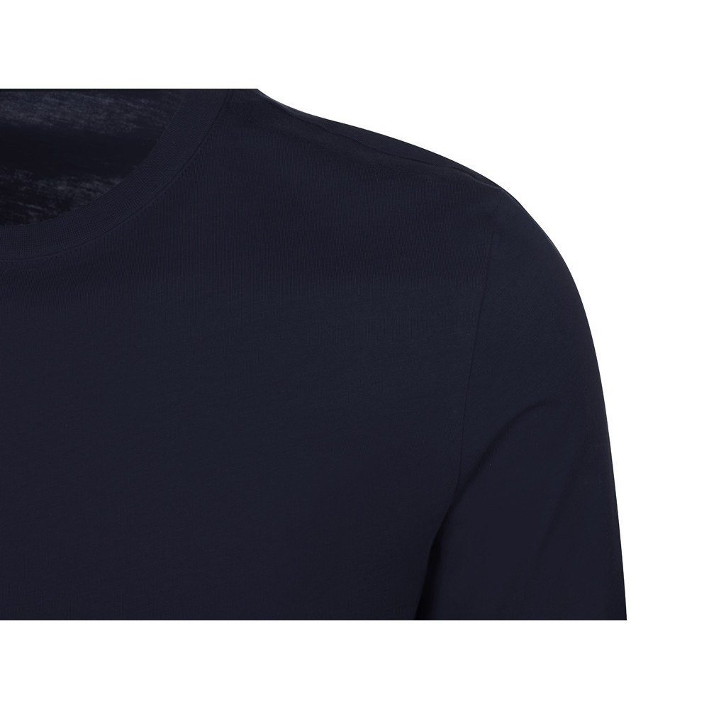 Футболка с длинным рукавом комфортной посадки с боковыми швами. Горловина обработана рибом 1х1 и тесьмой по спинке. Футболка выполнена из хлопкового джерси.