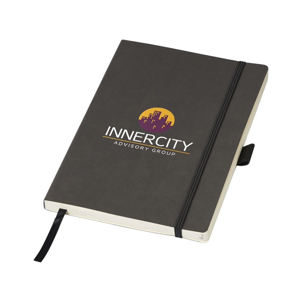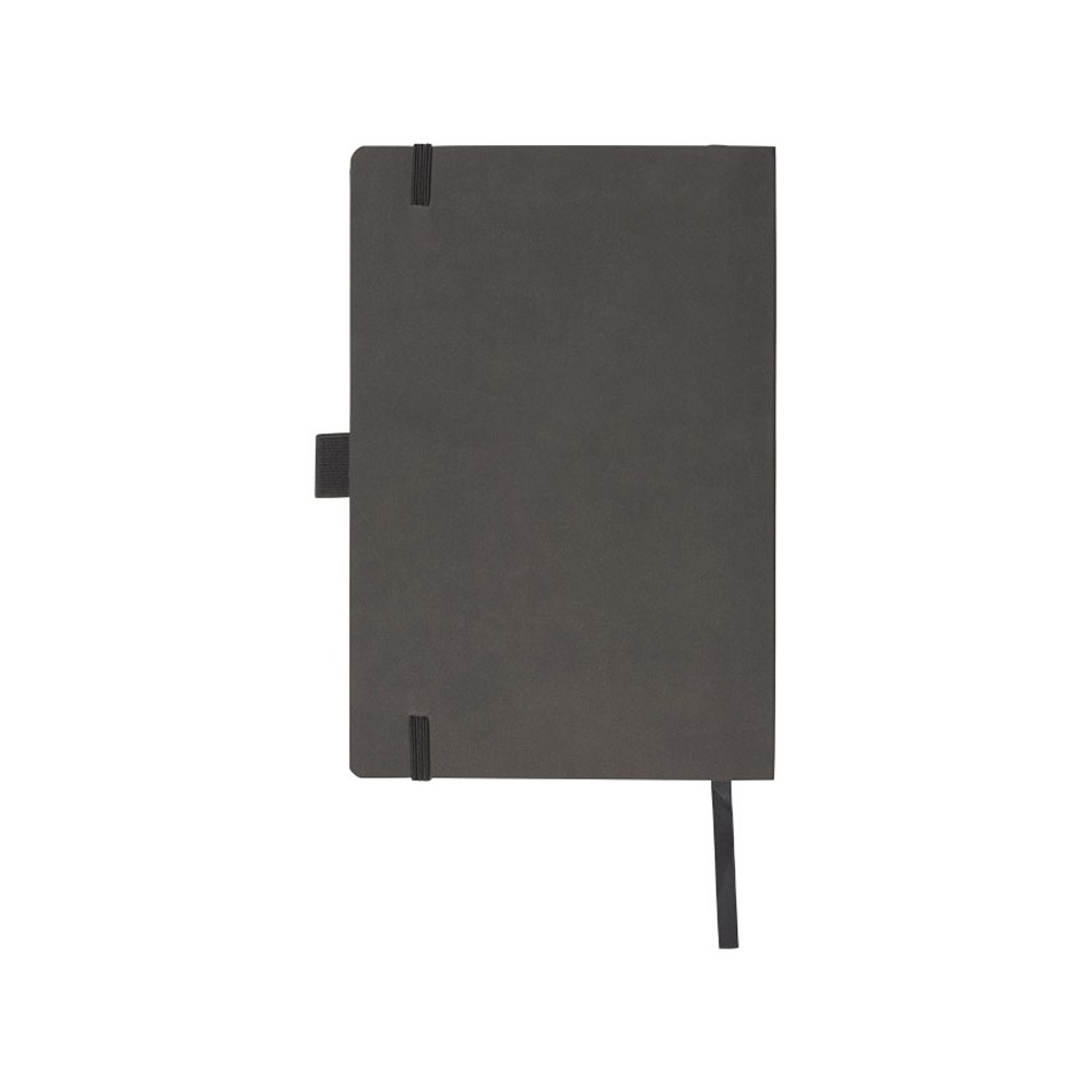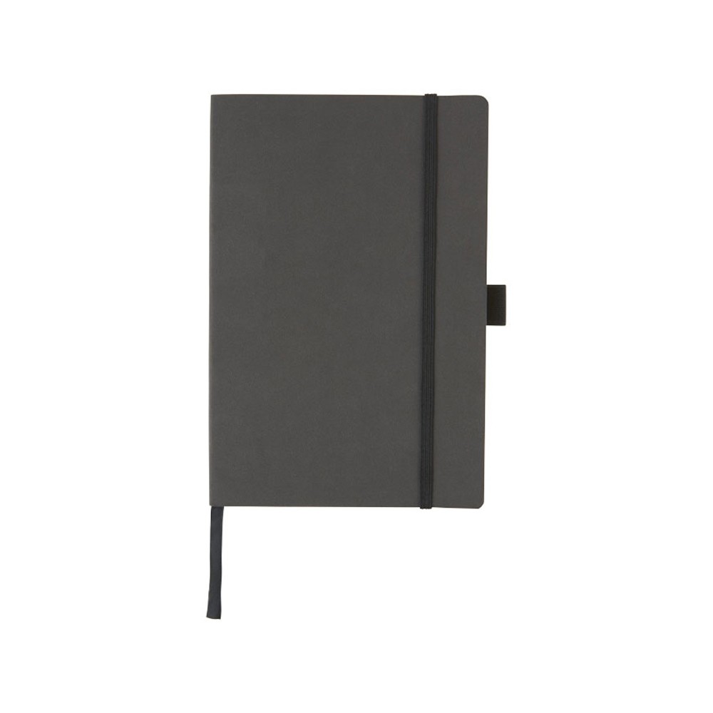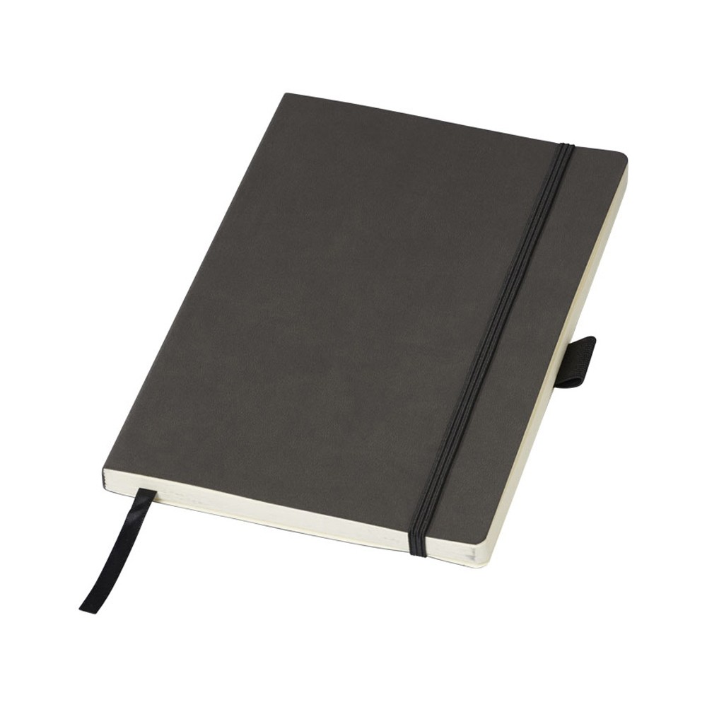 Блокнот Revello. Мягкий на ощупь, гибкий блокнот (размер А5 для ориентации) со встроенной эластичной застежкой, закладкой, петелькой для ручки и кармашка для документов на внутреннем форзаце сзади. 80 листов кремовой линованной бумаги (80г/м2). Упакован в черную коробку-рукав. Кожа ПУ.