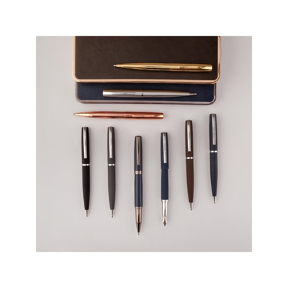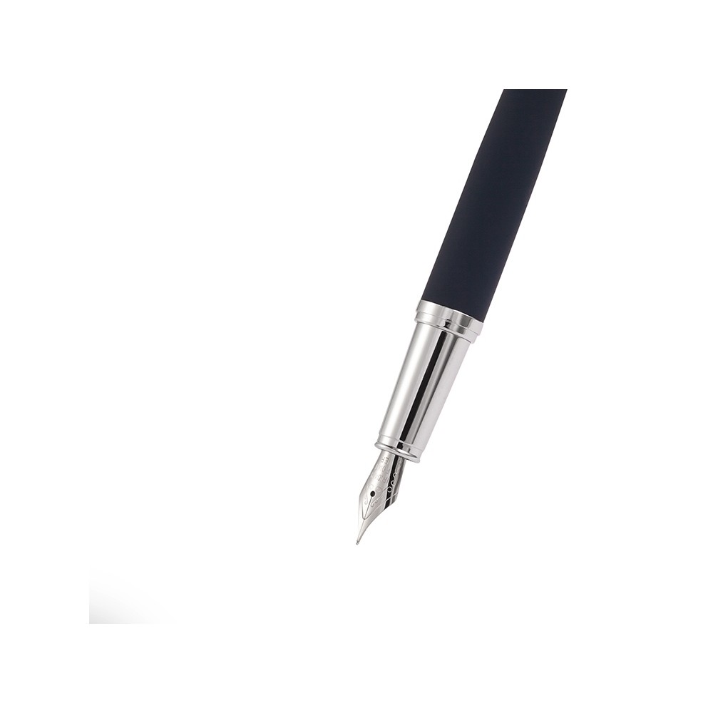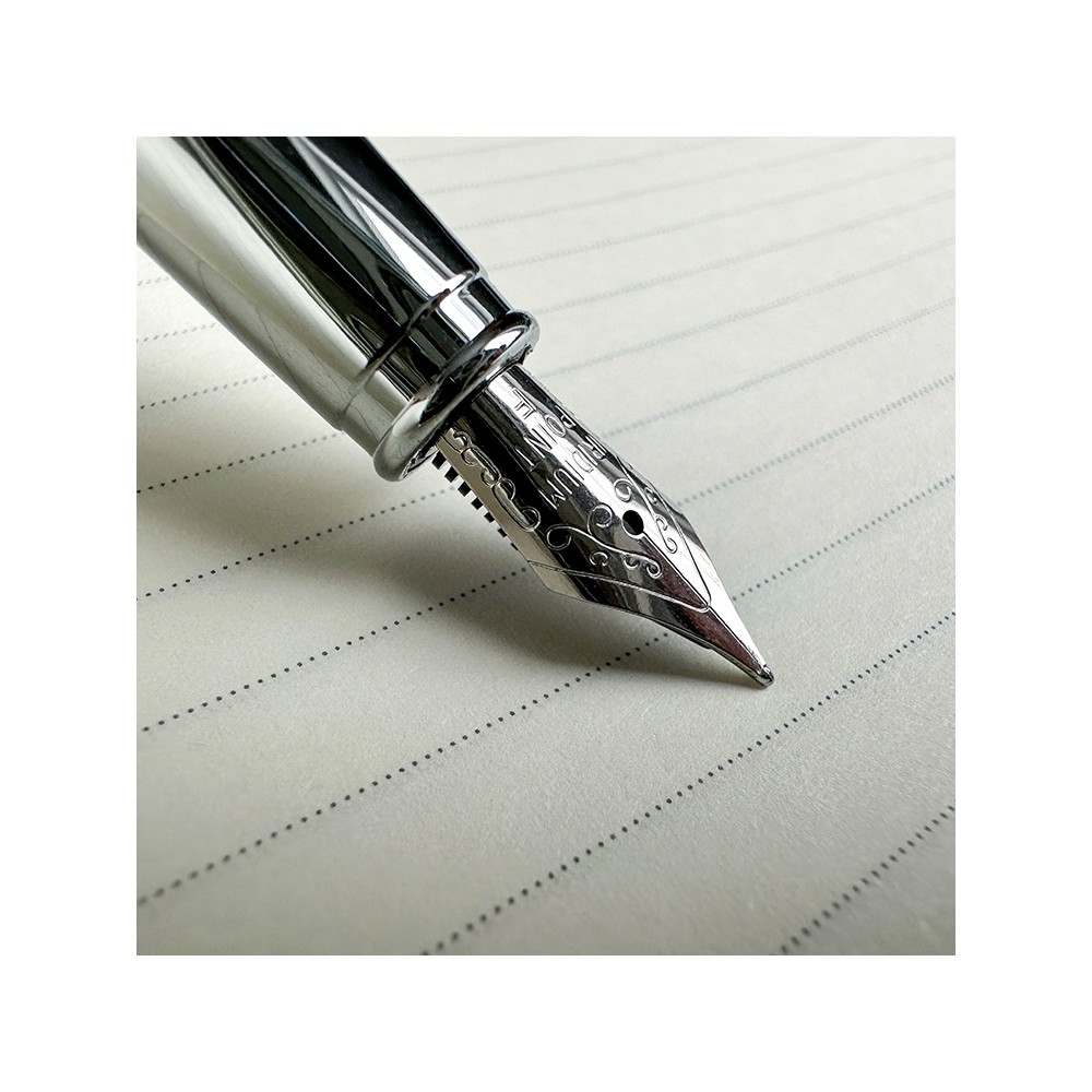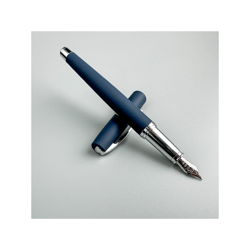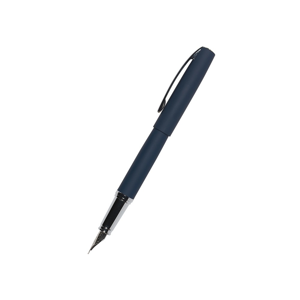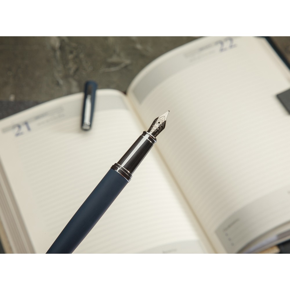 Cтильная перьевая ручка «Sienna» от Bruno Visconti синего цвета с контрастирующими элементами в цвет серебра. Благодаря покрытию Soft Touch пальцы не скользят по корпусу ручки, письмо комфортное и легкое. Ручка оснащена высококачественным механизмом подачи чернил, благодаря которому линия остается однородной и аккуратной. Чернила не токсичны, на основе водорастворимого красителя, не забивают фидер. Перьевой наконечник выполнен из иридиума и дополнен орнаментом.