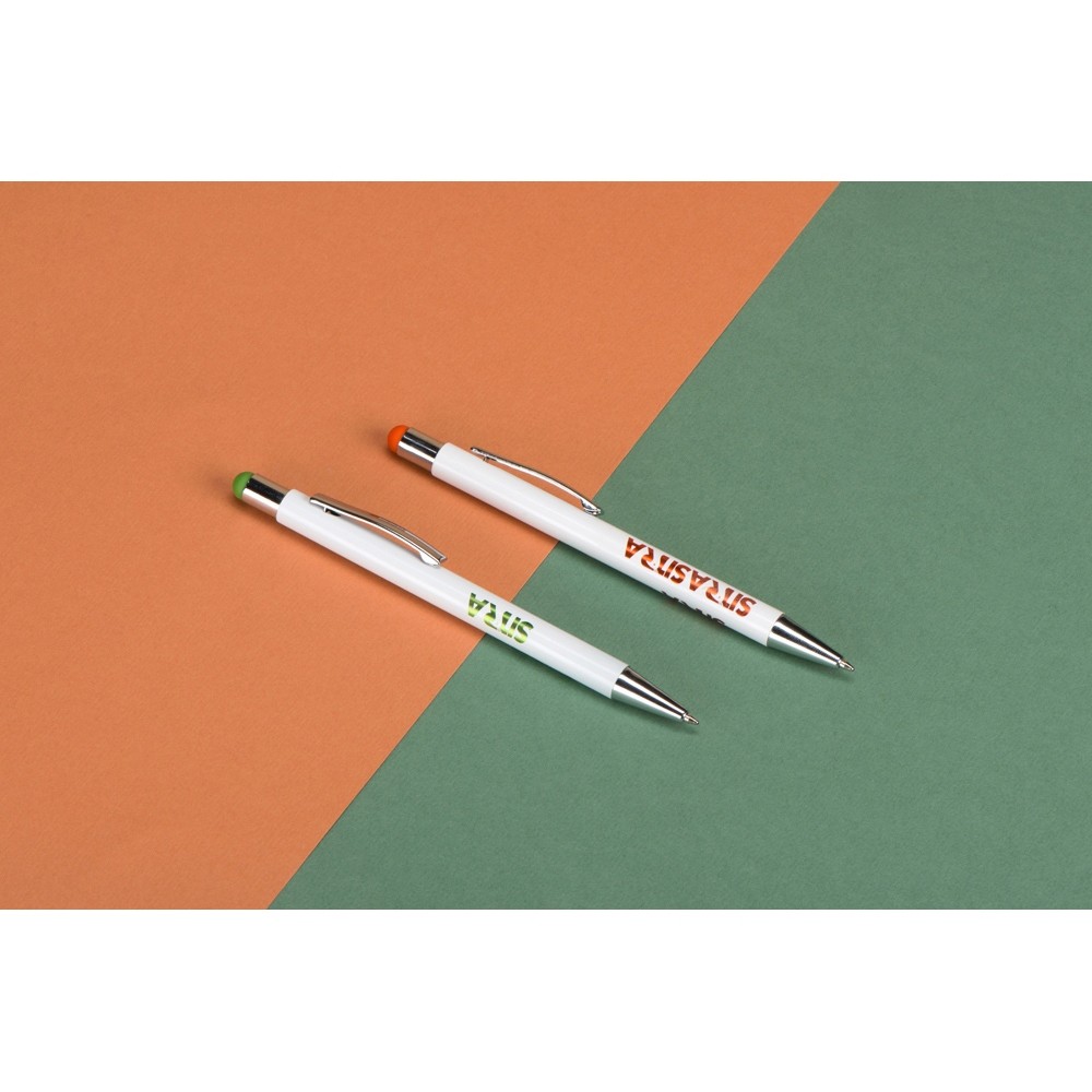 Металлическая шариковая ручка-стилус с нажимным механизмом. Под лакированным белым покрытием корпуса скрыт цветной зеркальный слой, раскрываемый в процессе гравировки. Зеркальный слой и стилус выполнены в едином цвете.