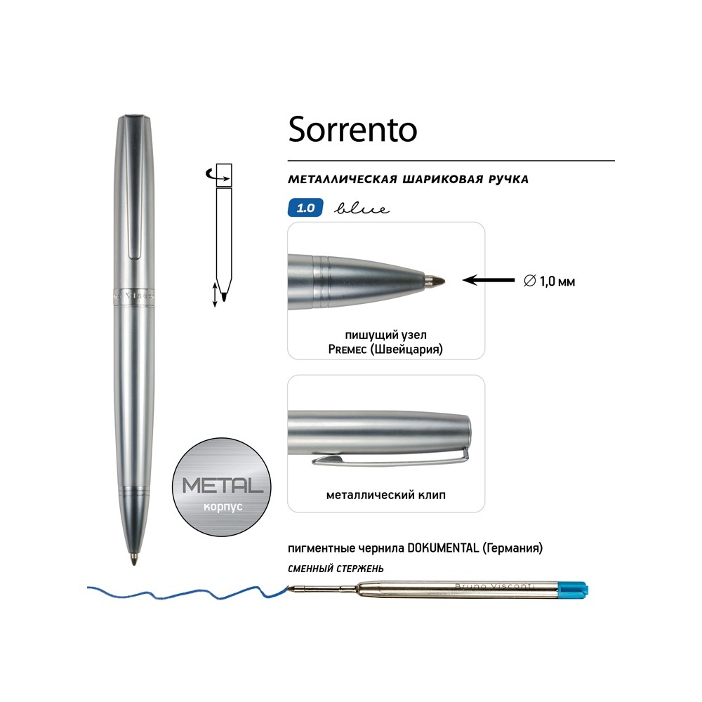 Как и все подарочные ручки Bruno Visconti, Sorrento - обладательница стержня с пишущим узлом от швейцарского производителя Premec и перманентными чернилами немецкого производителя Dokumental. Поэтому можно быть абсолютно уверенным в качестве письма.
