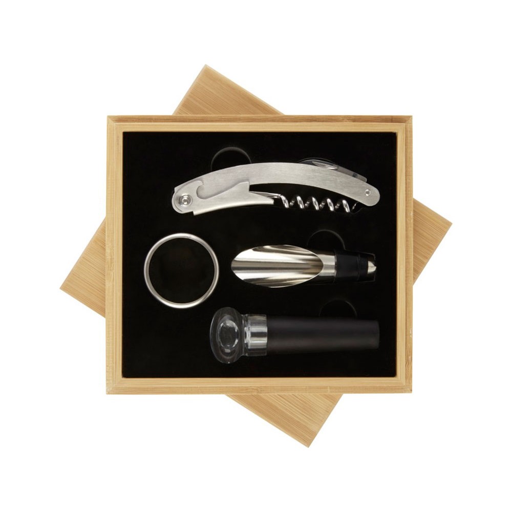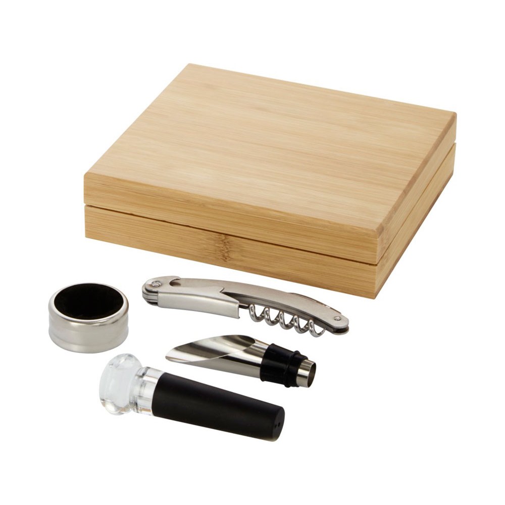 Набор для вина из 4 предметов: штопор, пробка, насадка на бутылку и кольцо. Поставляется в бамбуковой подарочной коробке, изготовленной в соответствии с экологическими стандартами.