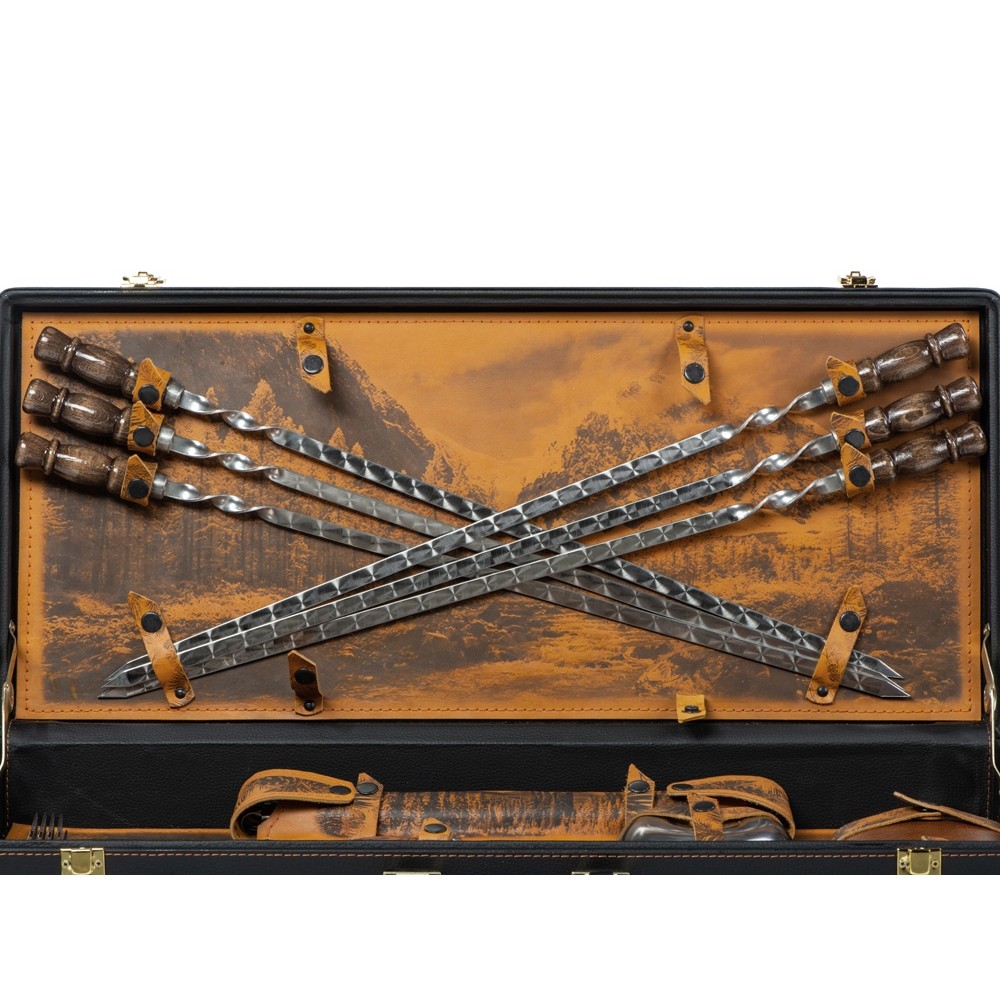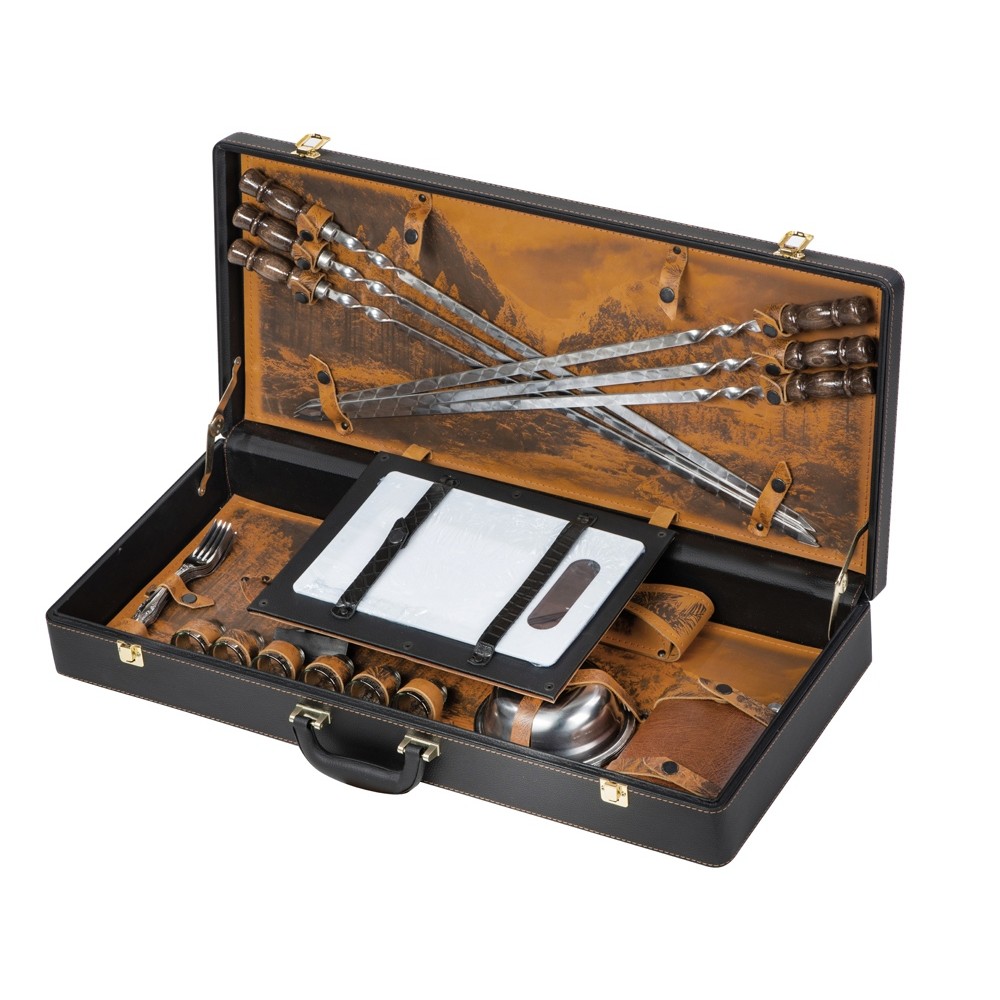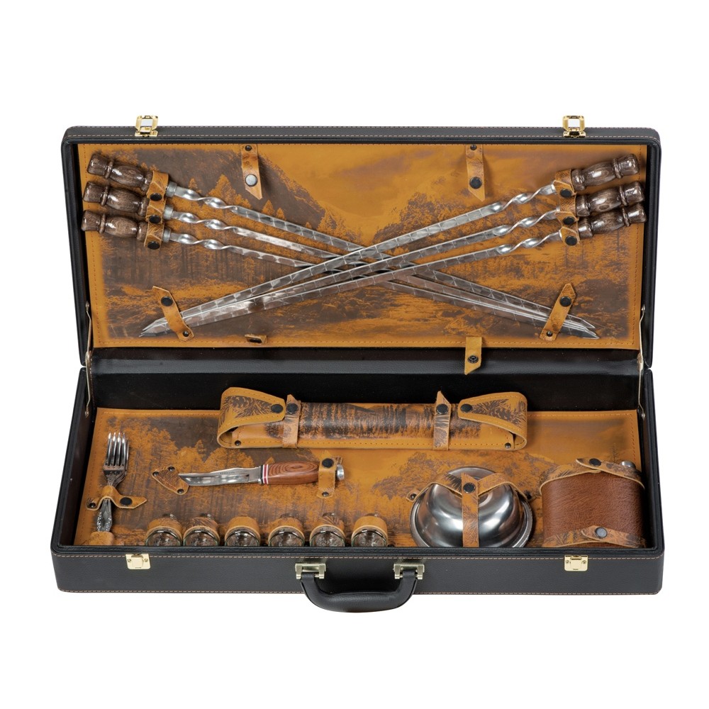 Комплектность шампура большие- 6 шт, доска разделочная, вилка- 6 шт, нож, стопка- 6 шт, тарелка- 6 шт, фляга, шампура маленькие- 6 шт, мангал