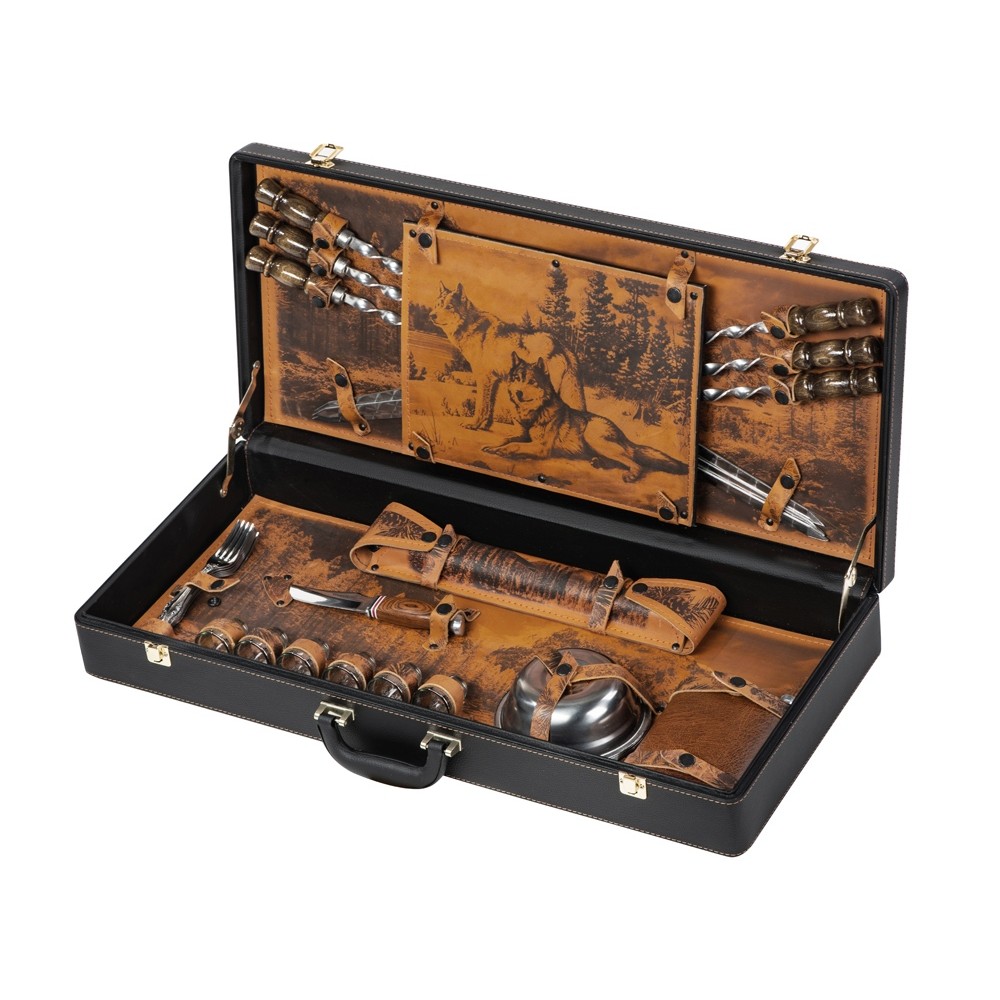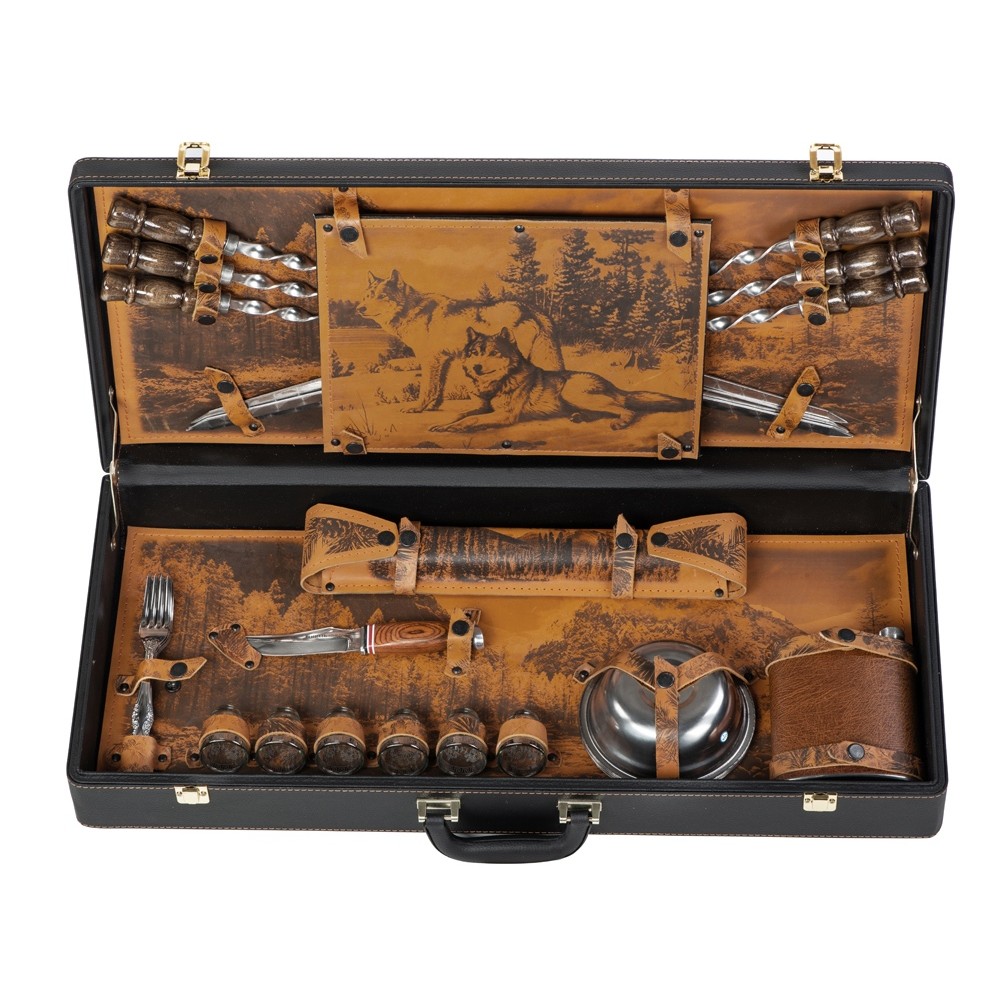 Вес7450 Комплектностьшампура большие- 6 шт, доска разделочная, вилка- 6 шт, нож, стопка- 6 шт, тарелка- 6 шт, фляга, шампура маленькие- 6 шт, мангал Материал товарасплит-кожа/натуральная кожа, нержавеющая сталь