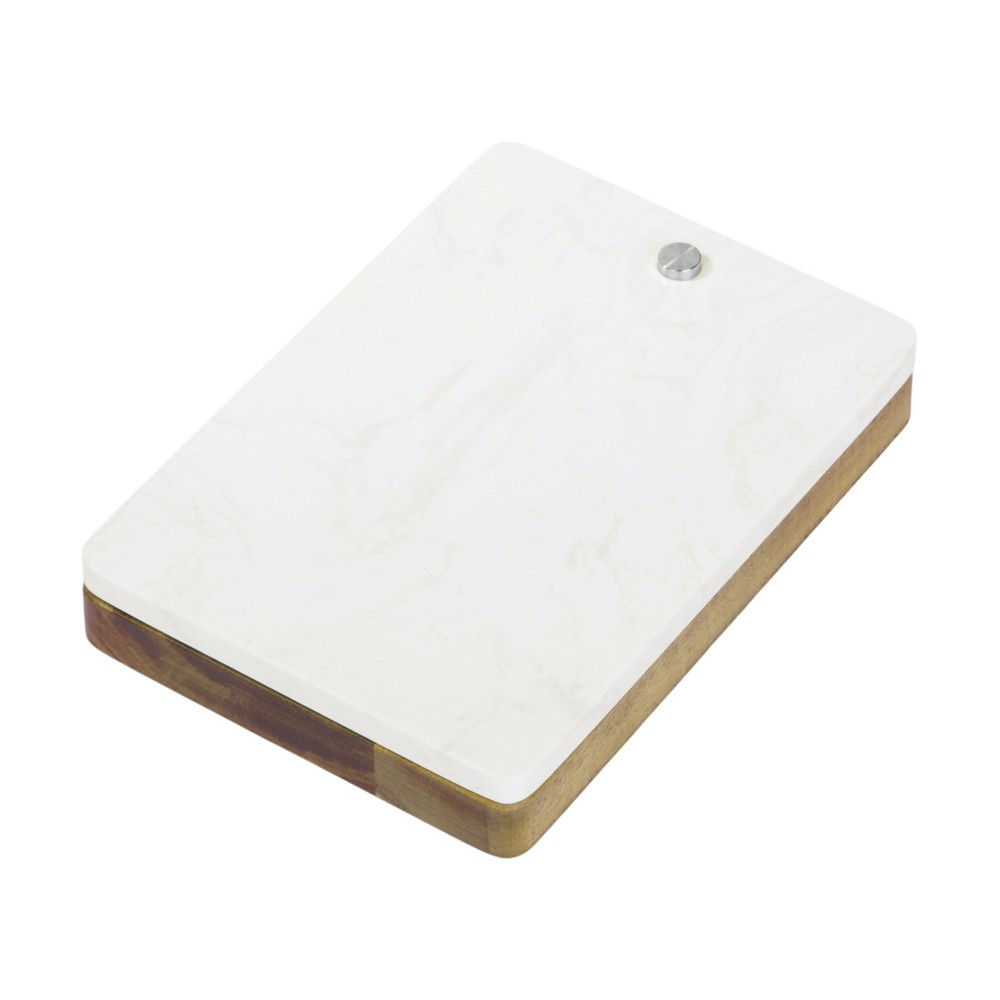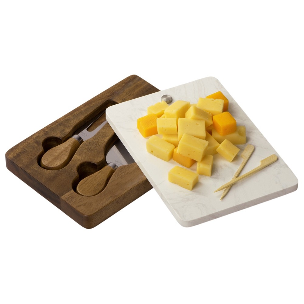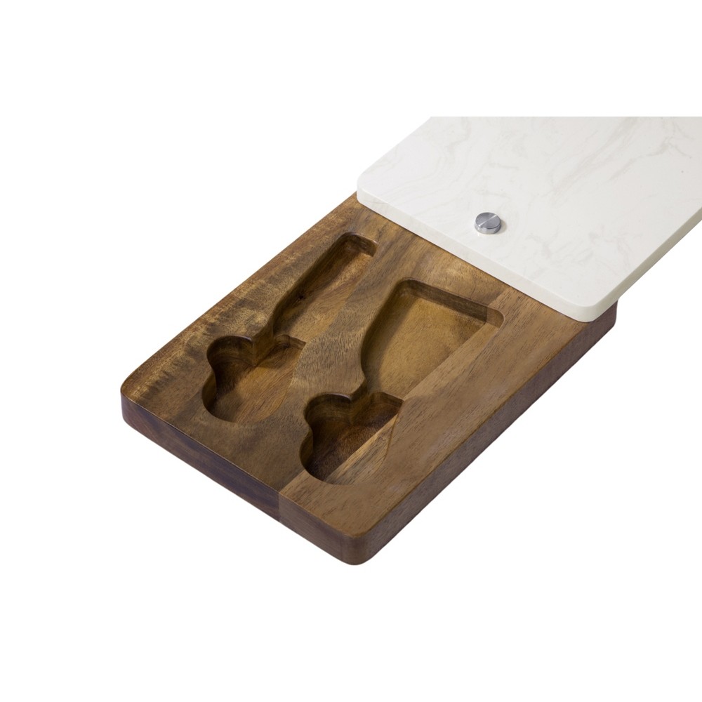 Набор для сыра бренда Eat&Bite Select состоит из ножа и вилки в футляре. Высококачественные материалы — акация и искусственный мрамор — обеспечивают набору долгую жизнь и благородный внешний вид. Крышка футляра, выполненная из белого мрамора, благодаря своей твердости может использоваться как разделочная доска, а благородный внешний вид делает ее идеальным вариантом для сервировки сыров и закусок.