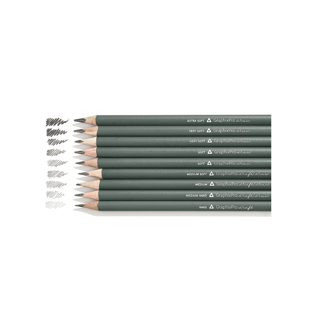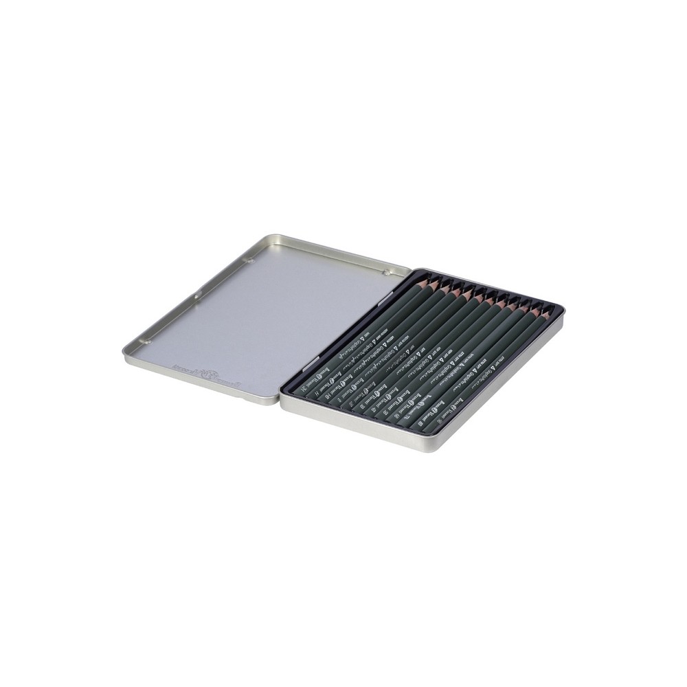 Комплектность 12 карандашей разной твердости (2H, H, HB, B, 2B, 3B, 4B, 5B, 6B, 7B, 8B, 9B), металлическая коробка