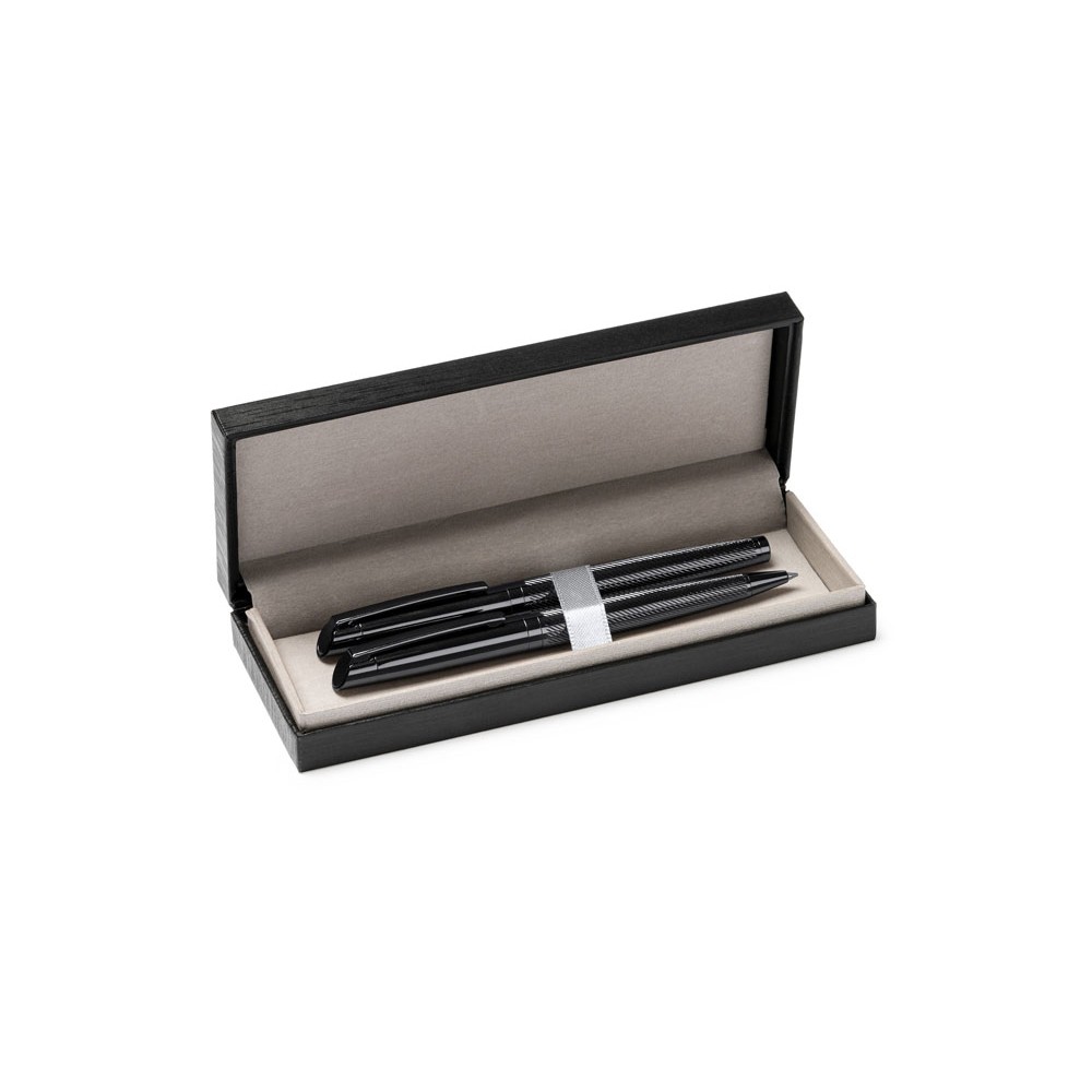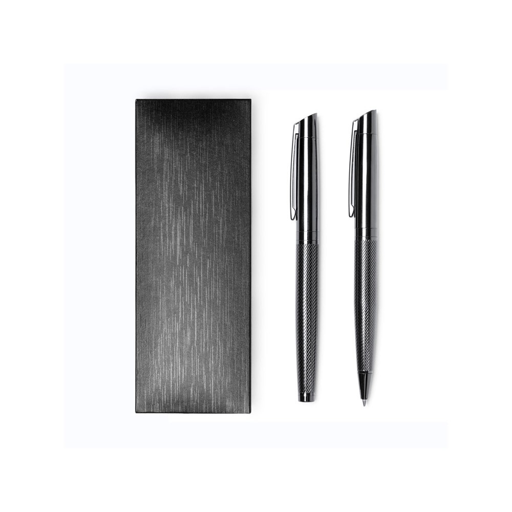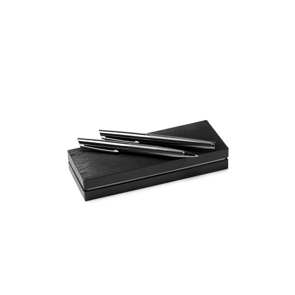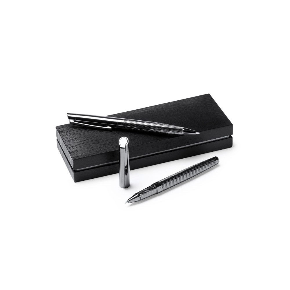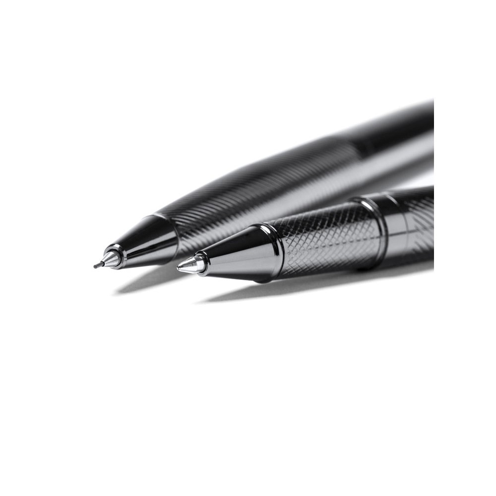 Элегантный набор, состоящий из ручки роллера и механического карандаша. Изготовлен из металла с затемненным рисунком. Поставляется в мягком футляре из кожзаменителя с внутренней подкладкой.
