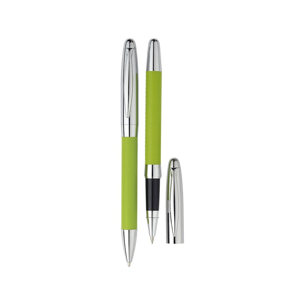 Стильный набор, состоящий из шариковой ручки, ручки-роллер и футляра с шильдом, обладает ярким дизайном и сочетанием фактур. Отличный подарок для женщин и мужчин. Ручки и футляр выполнены в единой цветовой гамме.