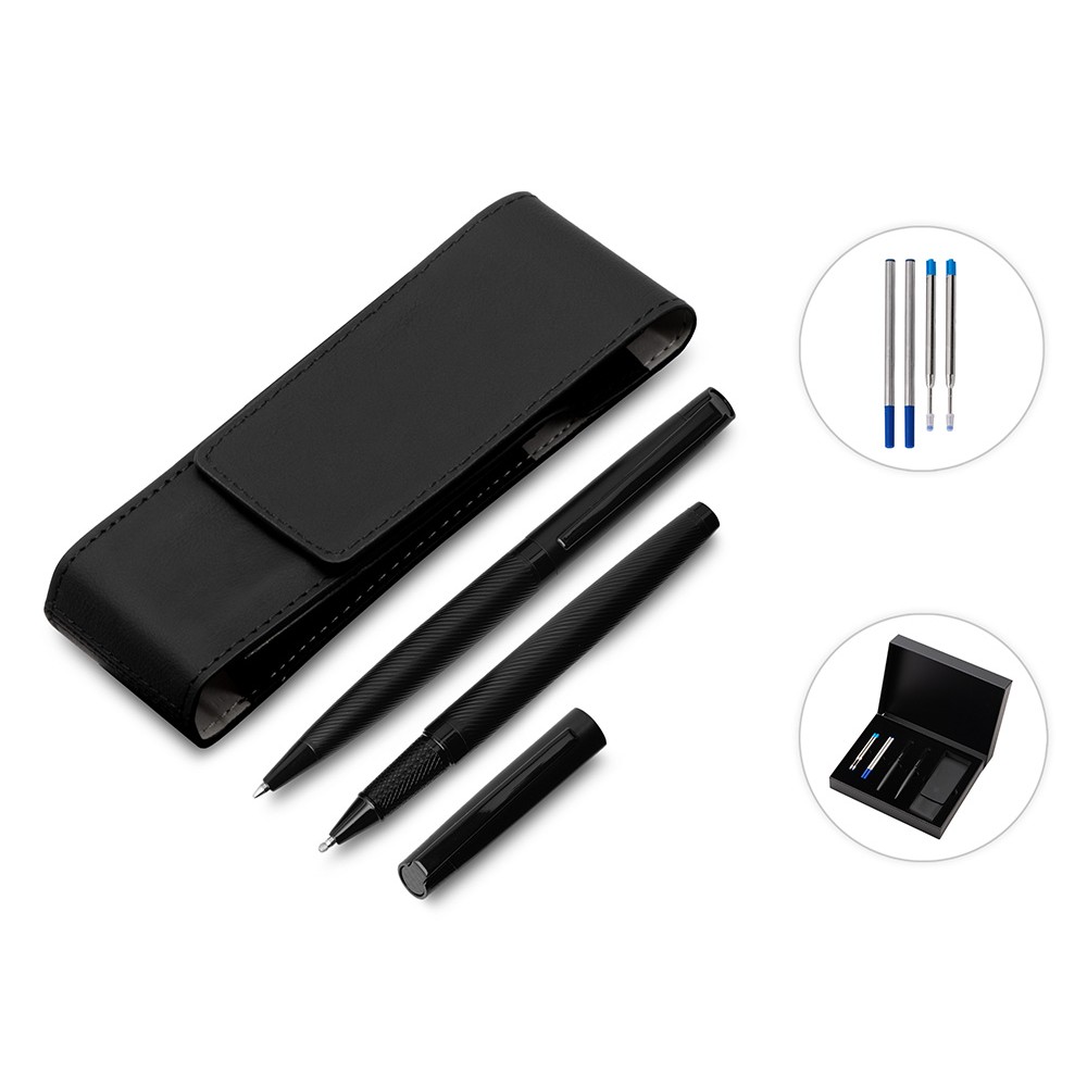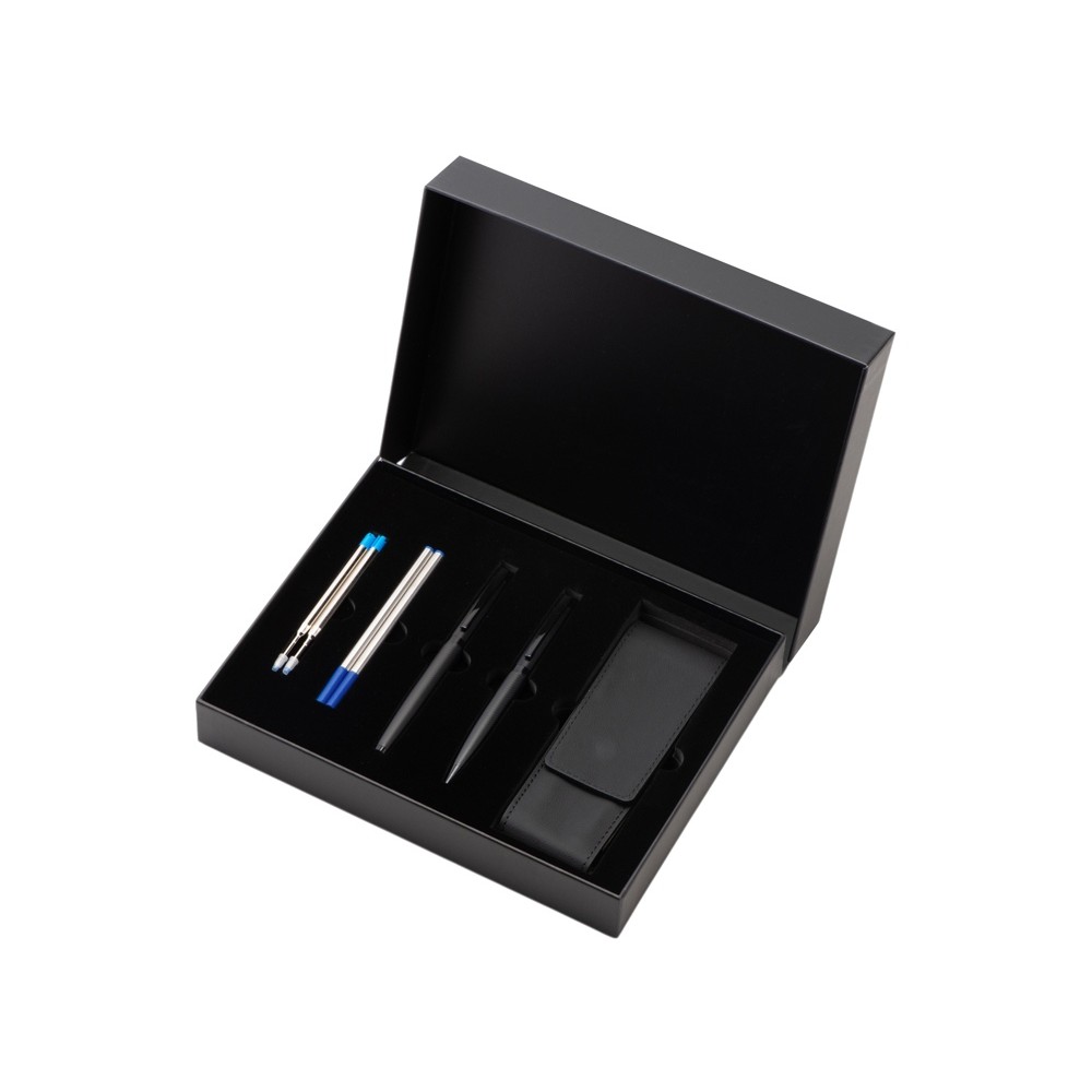 В набор входят шариковая ручка и роллер. Швейцарский пишущий узел Premec и немецкие чернила Dokumental обеспечивают мягкое и плавное письмо. Корпус каждой ручки имеет анодированный слой, благодаря которому гравировка получается с зеркальным эффектом.В набор входит также пенал для двух ручек, который также можно брендировать.