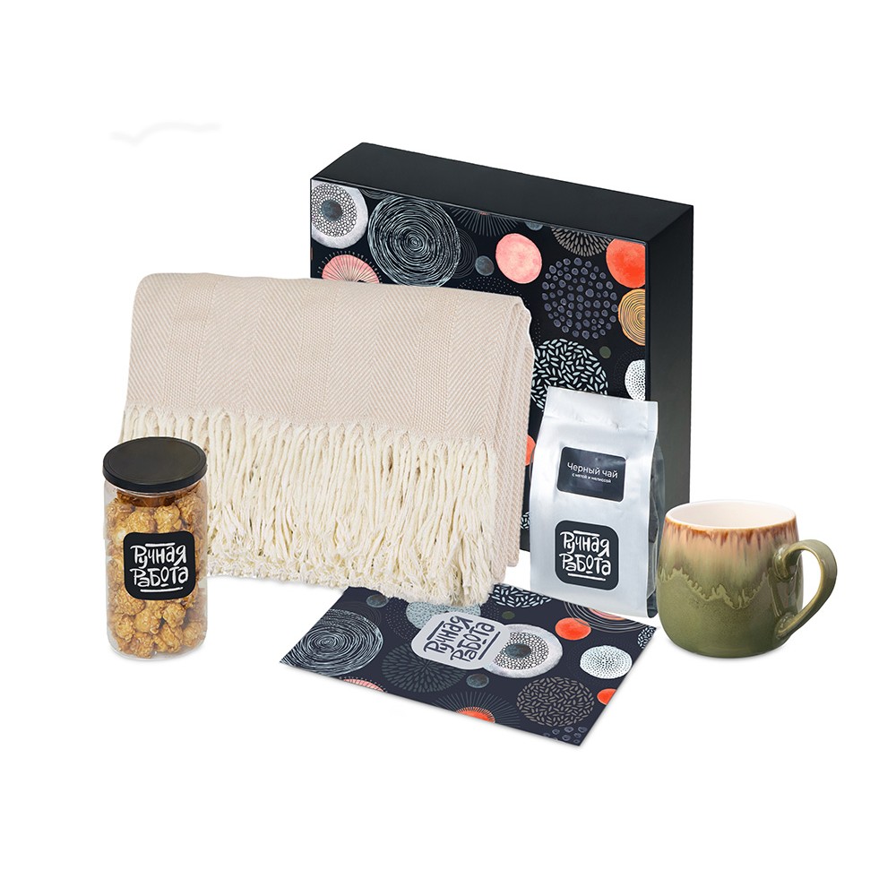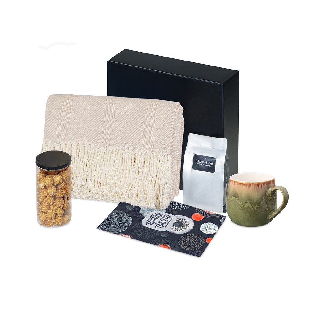 | Материал товара | плед - 100% хлопок, кружка - костяной фарфор с покрытием софт-тач, чай - пластик, попкорн - пластик, металл, мешок - нетканый материал (спанбонд), коробка - картон |
