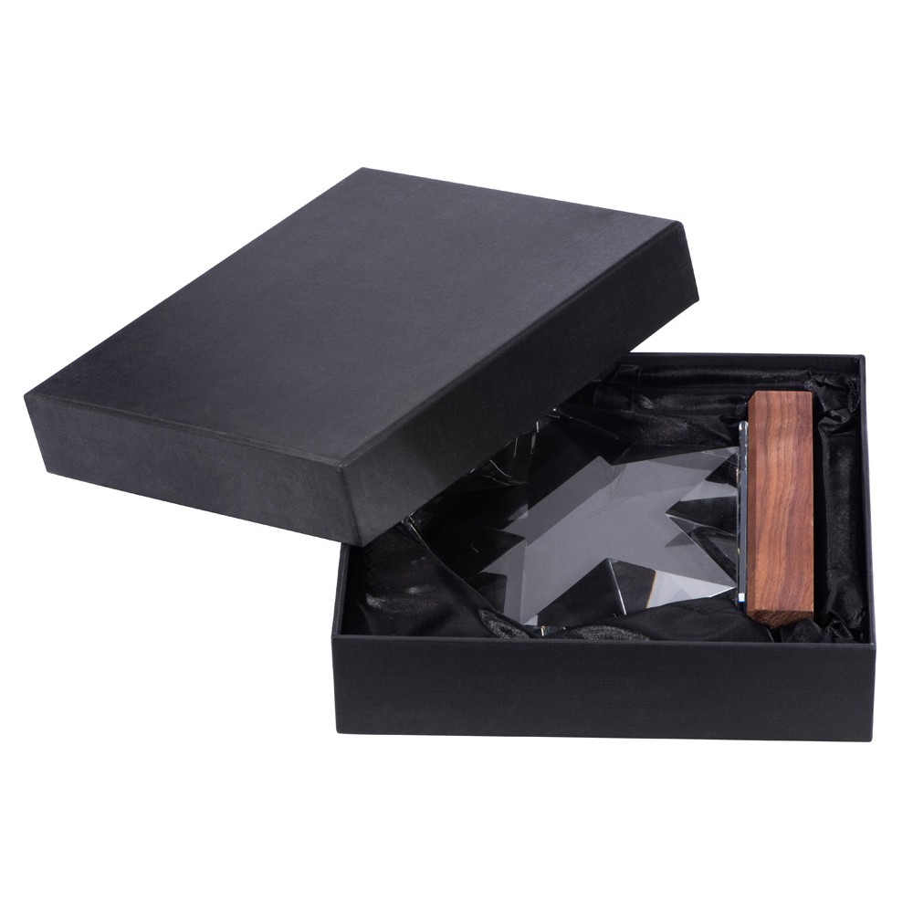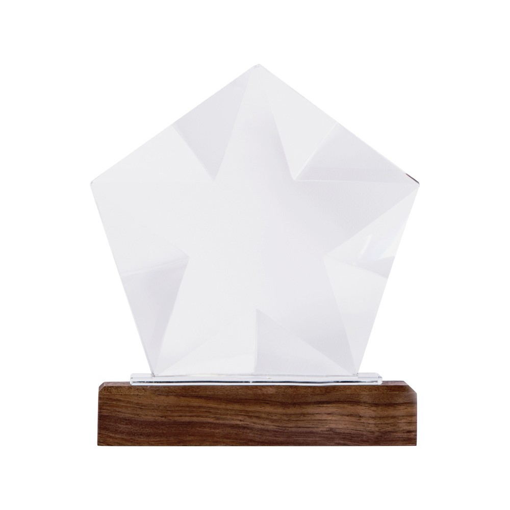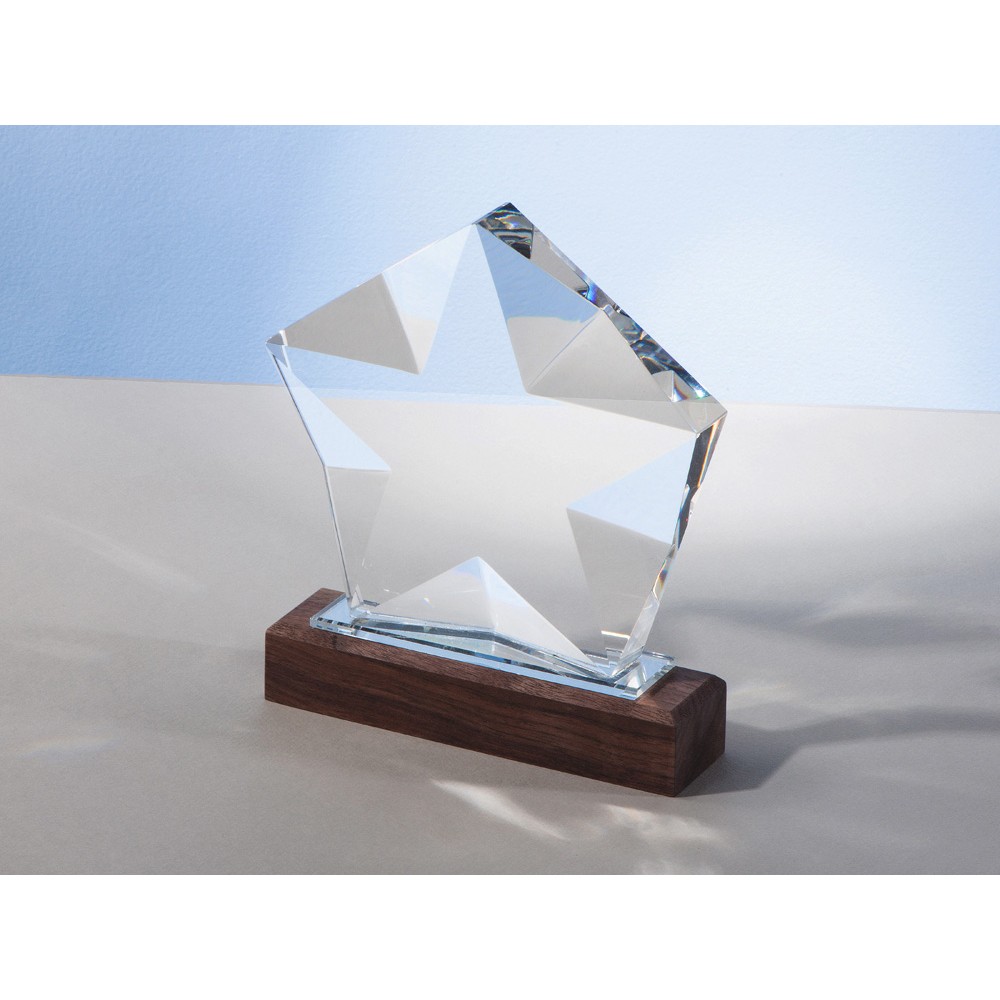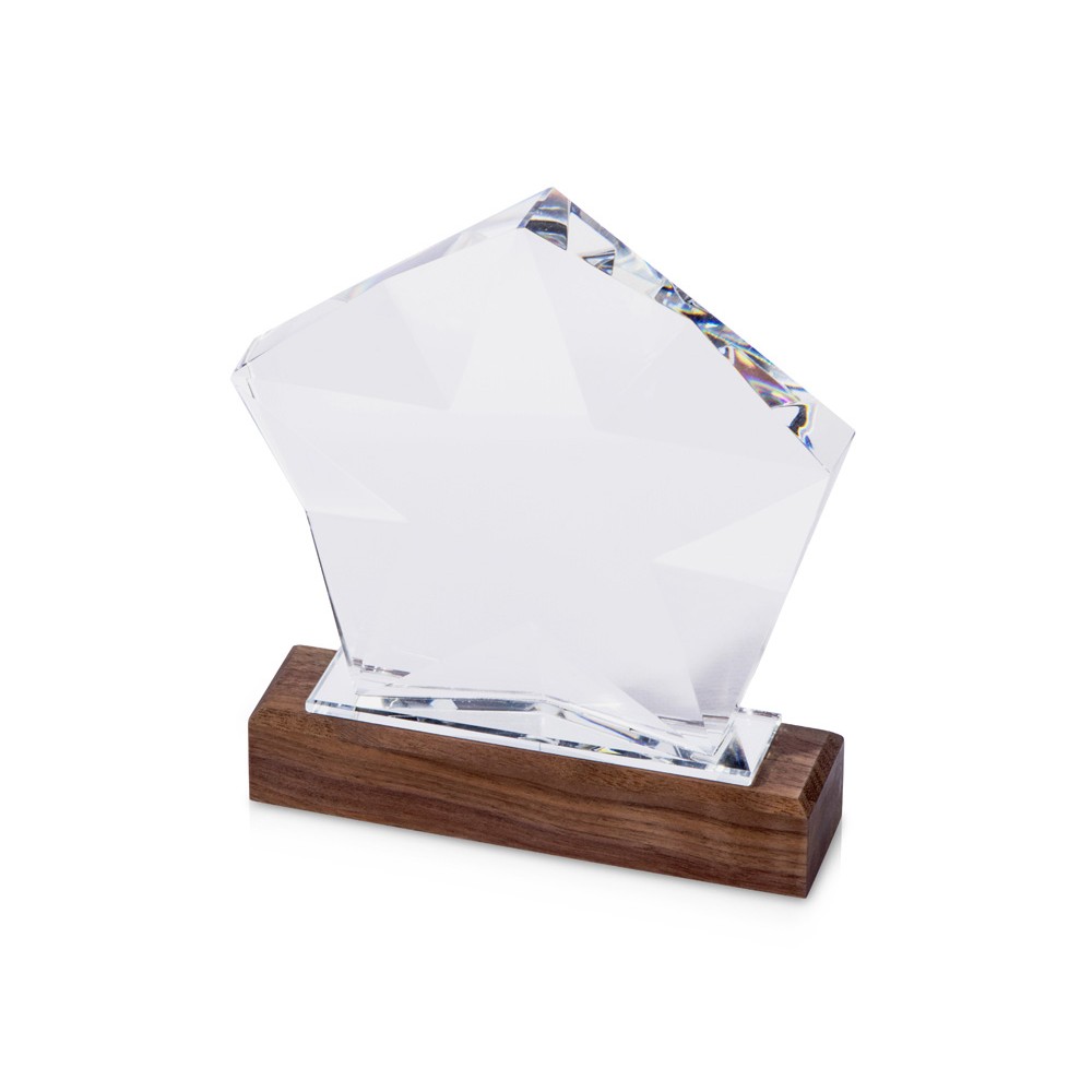 Награда выполнена из прозрачного стекла в виде звезды и расположена на деревянном постаменте. Благодаря выпуклым сторонам она интересно переливается в лучах света.