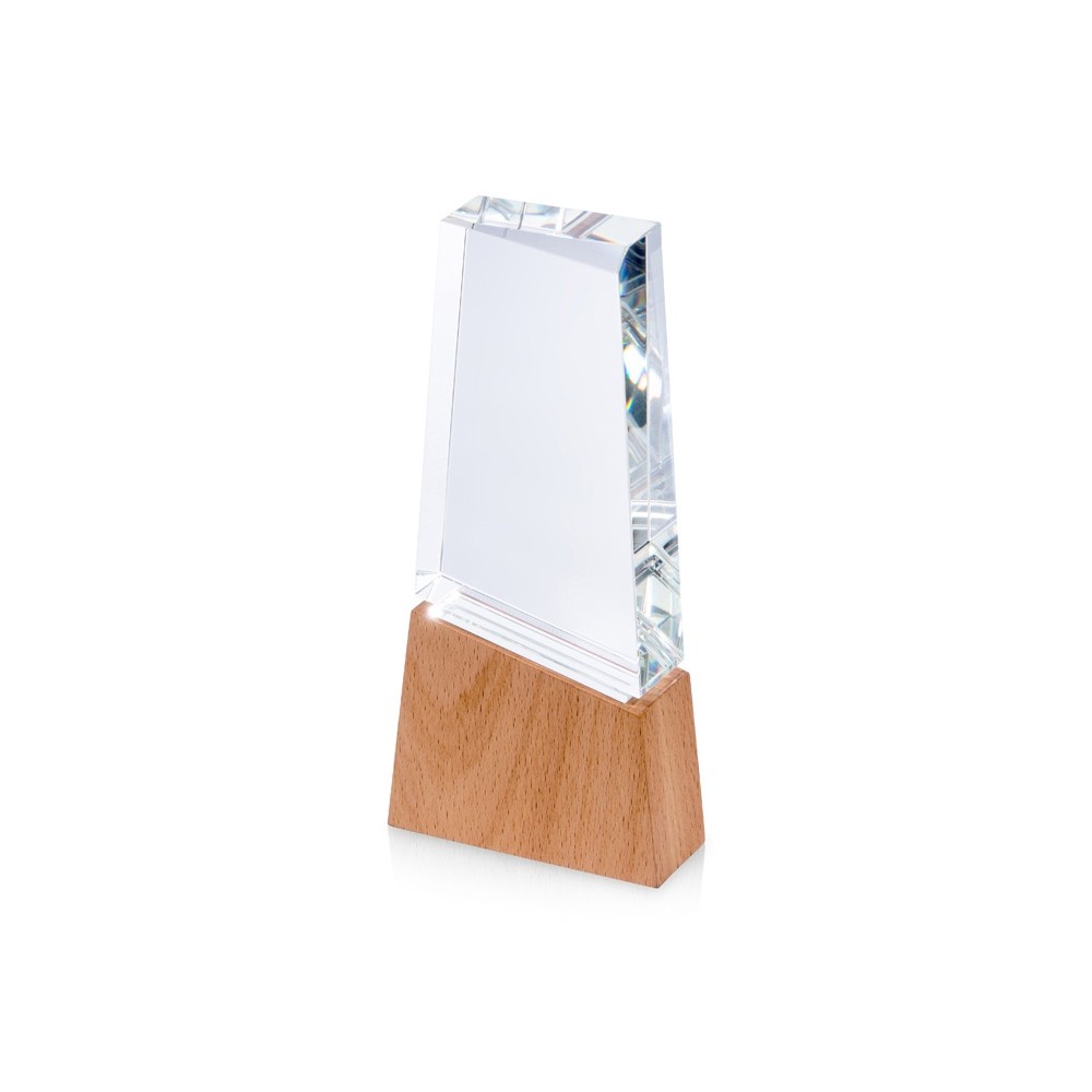 Награда выполнена из прозрачного стекла, имеет необычную форму и расположена на деревянном постаменте. Лаконична и минималистична.