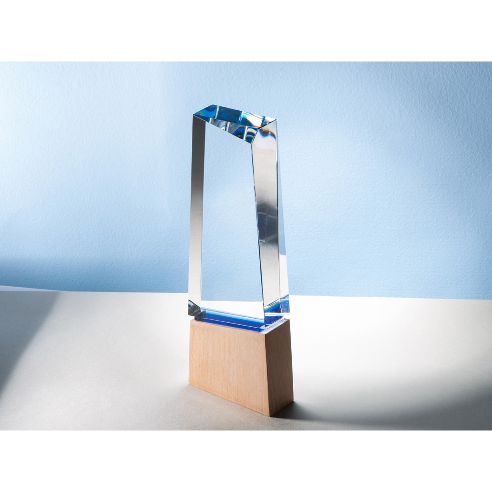 Награда выполнена из стекла, имеет необычную форму и расположена на деревянном постаменте. Лаконична и минималистична.