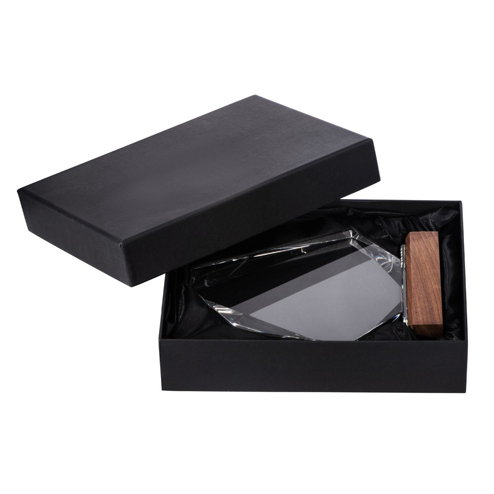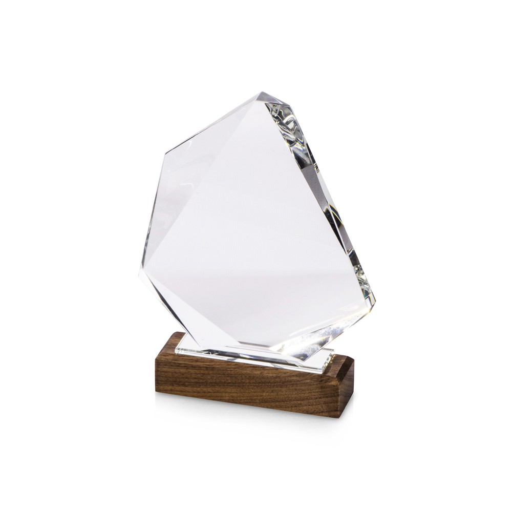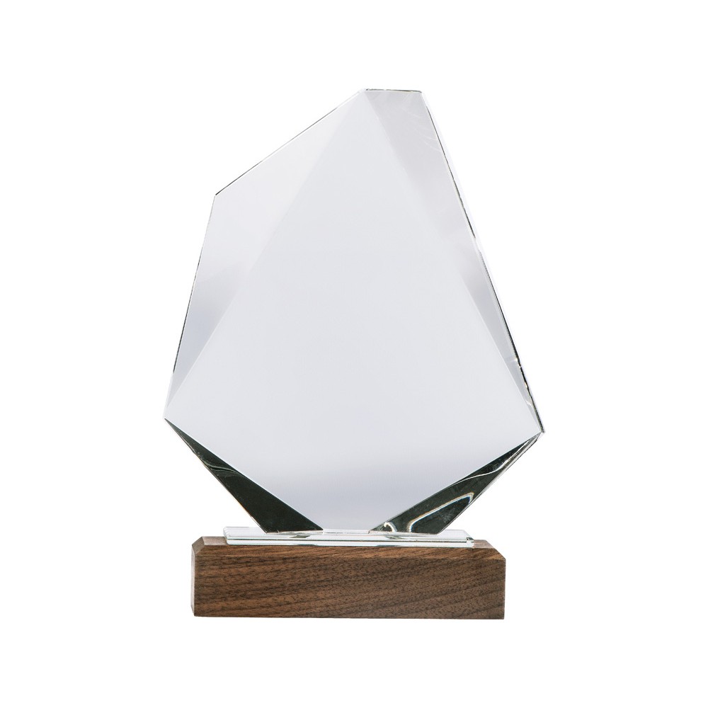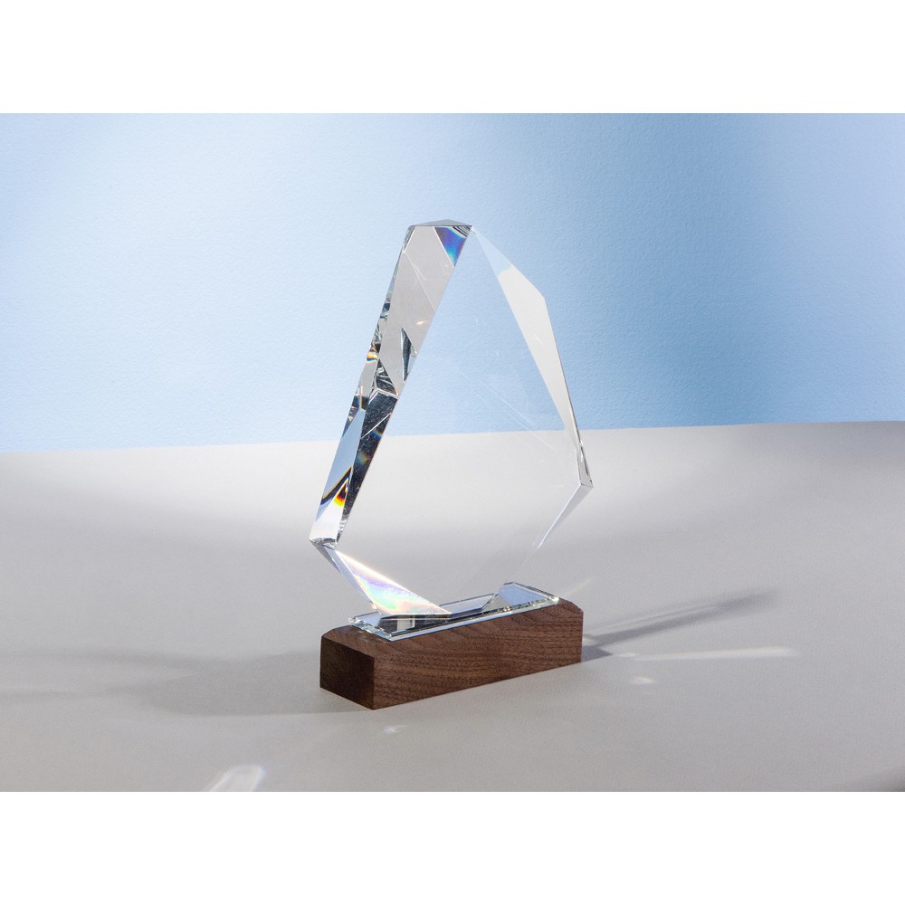 Награда выполнена из прозрачного стекла, имеет интересную асимметричную форму и расположена на деревянном постаменте.