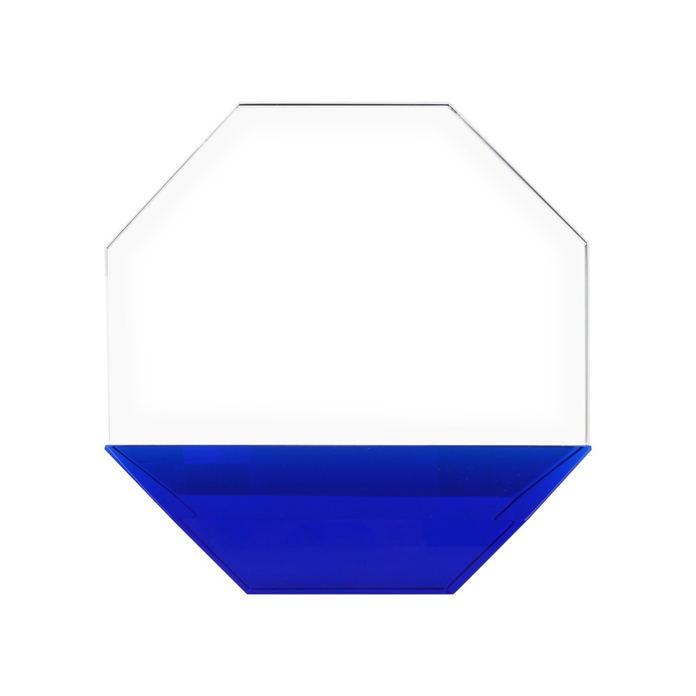 Награда в форме восьмигранника, который является древним символом наивысших достижений человека и духовного подъема, прекрасно выразит признательность и уважение, заложенное в такой бизнес-подарок. Нанесение доступно по всей площади награды, благодаря сочетанию прозрачного и синего стекла можно зонировать нанесение и экспериментировать с типами начертаний.