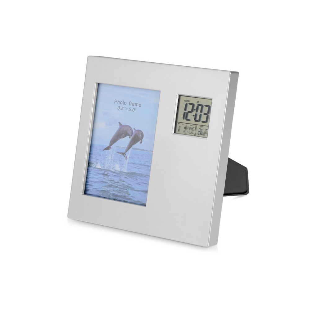 Часы с календарем, будильником, таймером, термометром и рамкой для фотографии 9х13 см. Есть возможность поменять положение цифрового табло с горизонтального на вертикальное, в зависимости от того, как поставлены часы.