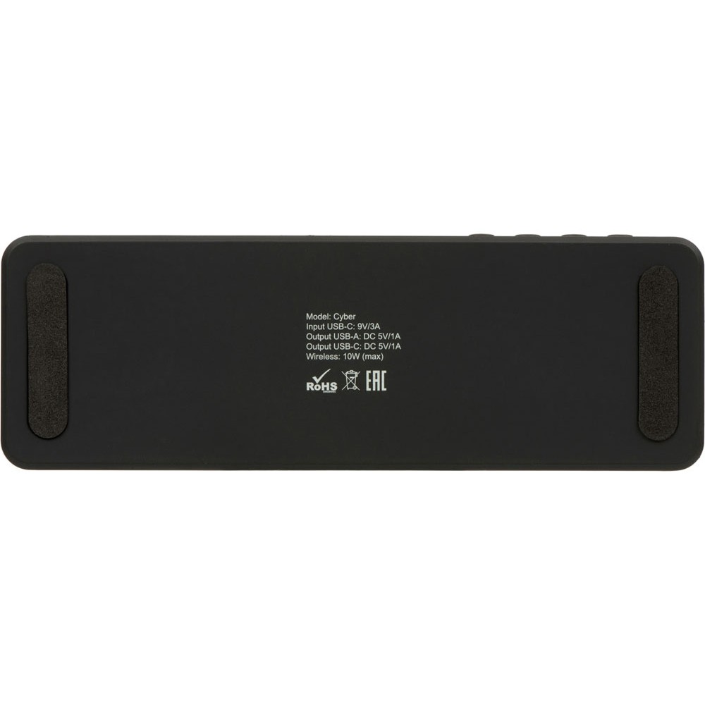 Посередине корпуса расположена беспроводная зарядка для смартфонов мощностью 10 Вт, а также два дополнительных зарядных разъёма USB-A и USB-C. Кабель с поддержкой быстрой зарядки в комплекте.