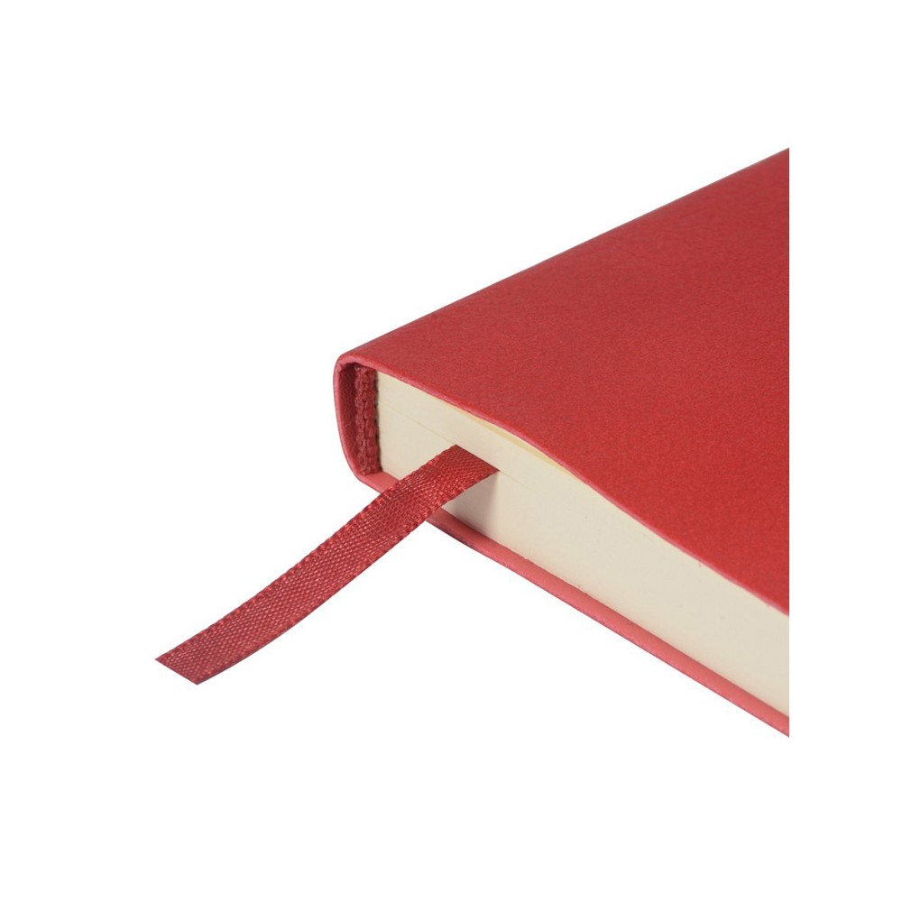 Лаконичная модель в ярком исполнении: гибкая обложка красного цвета с контрастной или в цвет обложки нашивкой. Выполнен из качественной и прочной искусственной кожи, крепление внутреннего блока - книжный переплет, закладка- ляссе. Углы обложки скруглены.
