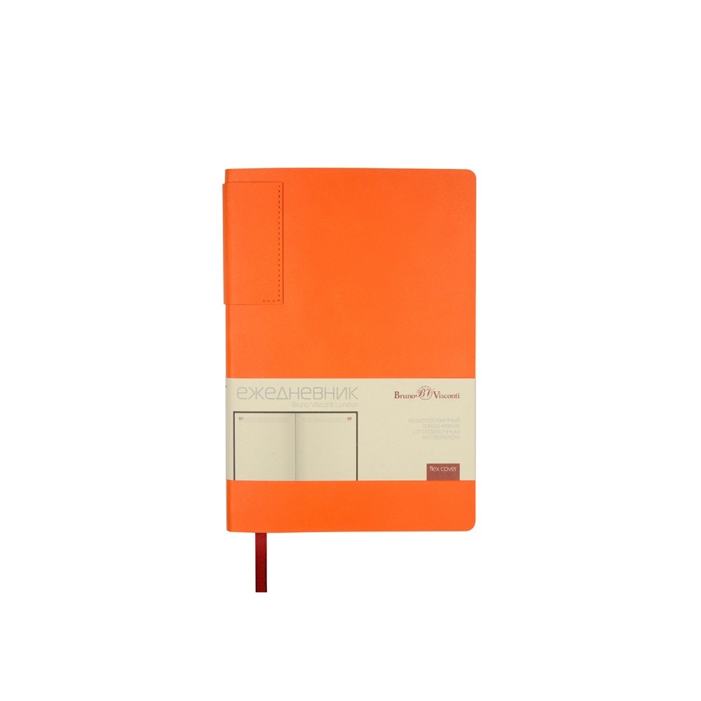 Лаконичная модель в ярком исполнении: гибкая обложка оранжевого цвета с контрастной или в цвет обложки нашивкой. Выполнен из качественной и прочной искусственной кожи, крепление внутреннего блока - книжный переплет, закладка- ляссе. Углы обложки скруглены.