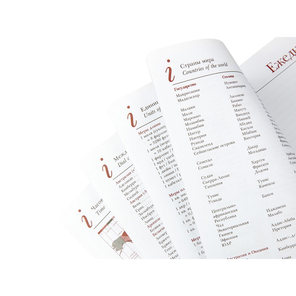 В ежедневнике «Sidney Nebraska» есть полезная справочная информация и телефонная книга на 18 листов, а также 272 страницы для записи идей, мыслей и составления рабочих планов. Для изготовления страниц используется качественный белый офсет повышенной плотности (70 г/кв м) с золотым срезом, который производится в Японии и подходит для всех видов чернил. Разметка блока с указанием времени позволяет планировать дела с точностью до 1 часа.