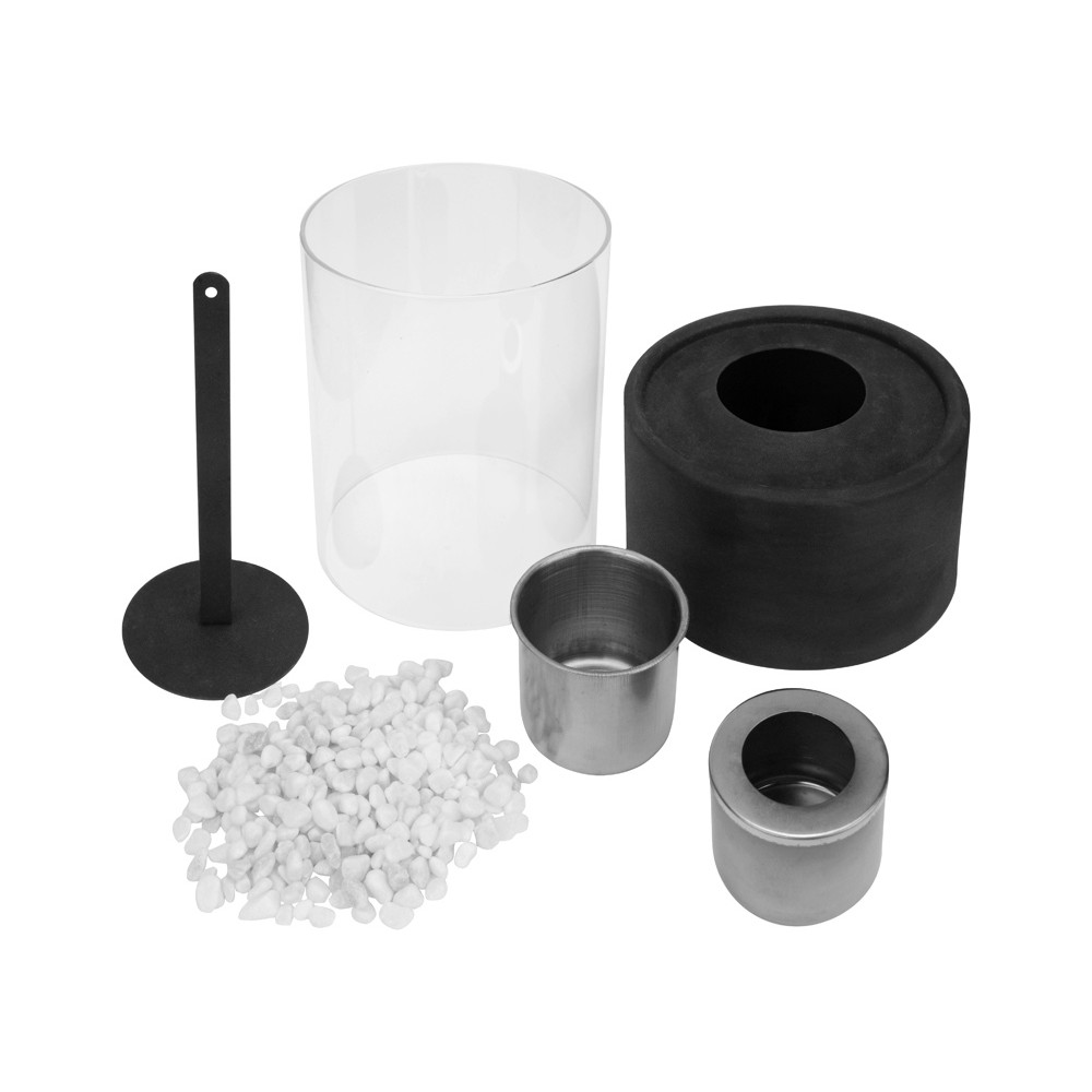 Комплектность биокамин со стеклянной колбой- 1шт, емкость для топлива- 1шт, декоративные камни, заглушка для тушения пламени- 1шт, инструкция по применению