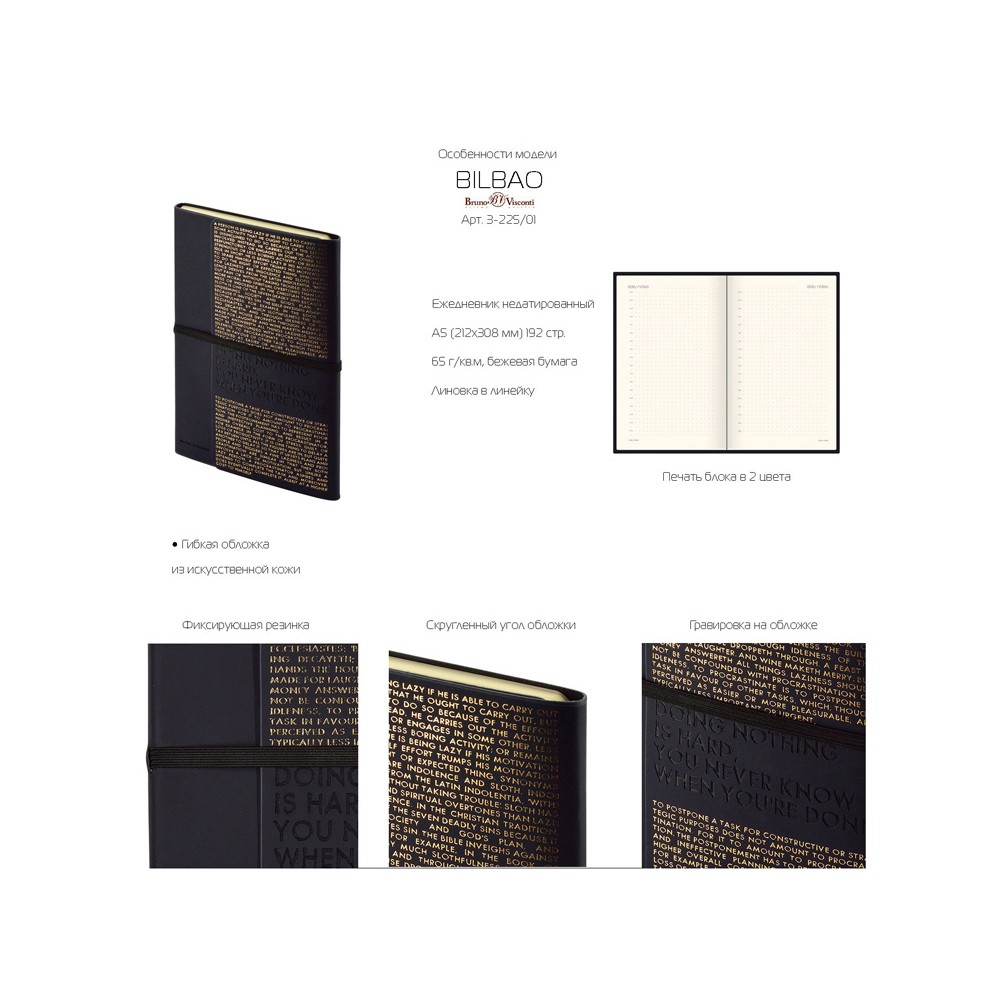 Так трудно ничего не делать, ведь совершенно непонятно, когда ты закончишь! Лаконичный слоган мотивирует к активным действиям. Планируй и завершай! Вот что кроется в элегантной надписи, выполненной золотым тиснением! А Flex обложка напоминает «Будь гибким! Великолепный недатированный ежедневник Bilbao черно-синего цвета с тиснением фольгой. Бежевая бумага 65 г/м, широкая горизонтальная фиксирующая резинка. Гибкая обложка с покрытием Soft-touch. Особенность этого ежедневника - часть обложки внахлест может использоваться как закладка. Ежедневник упакован в картонный полукороб и термопленку.
