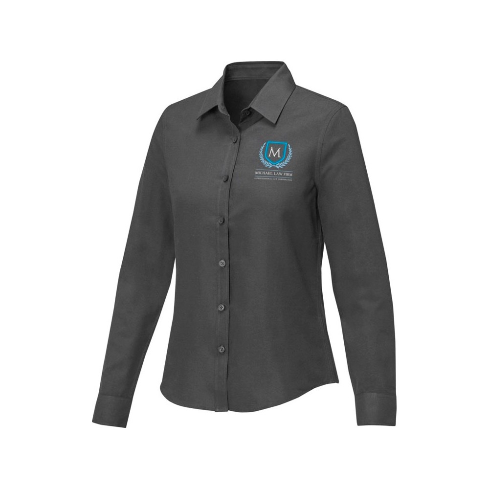 Pollux женская рубашка с длинными рукавами. Отрывной-отрезной лейбл. Регулируемая манжета рукава с одной складкой. Пуговицы в тон. Встречная складка на спинке. Ткань Оксфорд 55% хлопка, 45% полиэстера, 130гр.