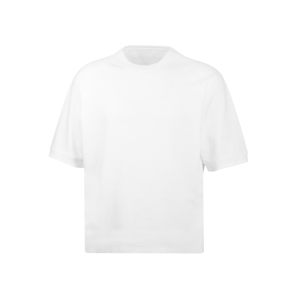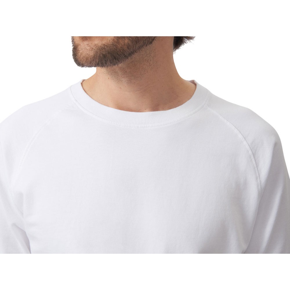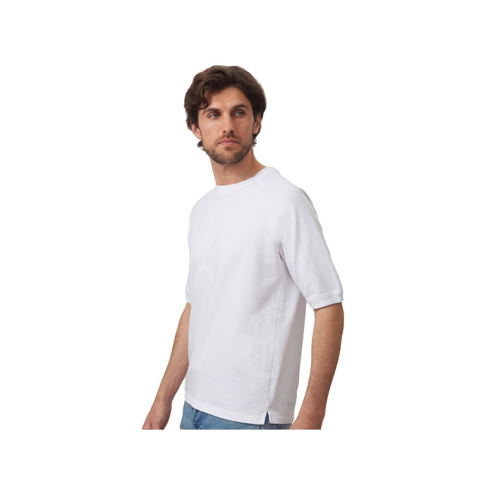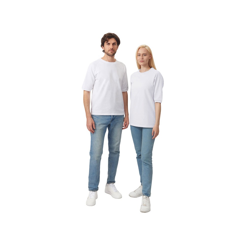Футболка выполнена из хлопкового френч терри с петельками на изнаночной стороне. Горловина обработана рибом 2х2 и дополнительно усилена тесьмой-елочкой с внутренней стороны спинки и дополнена кокеткой по спинке для нанесения логотипа клиента. Рукав реглан продублирован рибом по низу. Разрезы в боковых швах. Гладкая поверхность полотна позволяет идеально нанести изображение. Футболка комфортного силуэта.