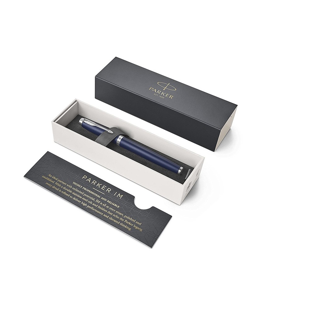 Перьевая ручка Parker IM из обновленной коллекции IM. Основные особенности нового дизайна: новый зажим-стрела с тремя широкими перьями, укороченная форма торца на колпачке, широкое кольцо на колпачке теперь состоит из 3 соединенных вместе колец, на среднем выполнена гравировка логотипа PARKER. Корпус перьевой ручки выполнен из латуни и покрыт многослойным матовым покрытием синего цвета, отдельные детали дизайна покрыты хромированной латунью, зона захвата изготовлена из блестящего пластика. Перьевая ручка оснащается пером из нержавеющей стали в новой привлекательной форме.