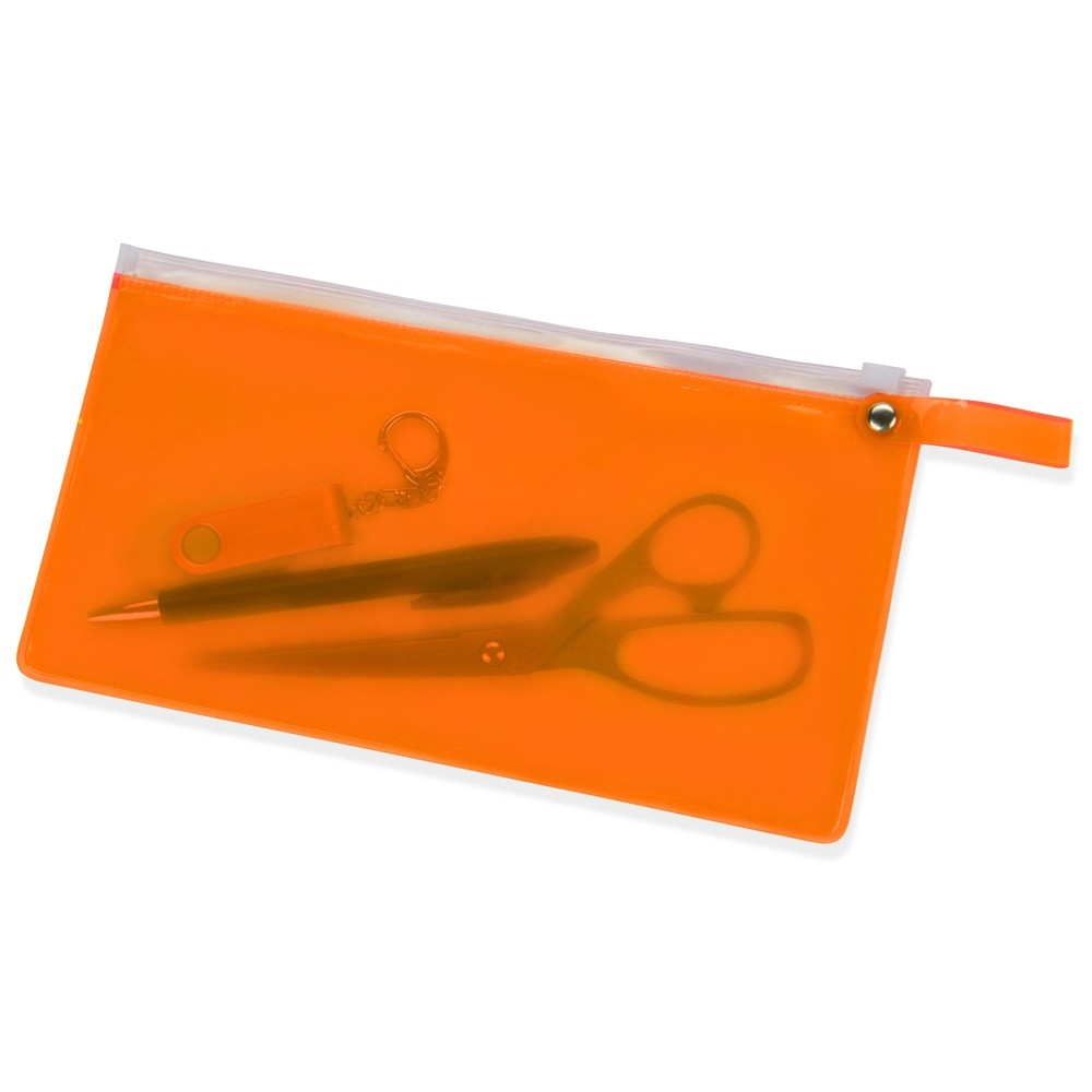 Яркий пенал из ПВХ закрывается на zip-замок. На этот пенал можно нанести название компании и вложить в него несколько сувениров небольшого размера.