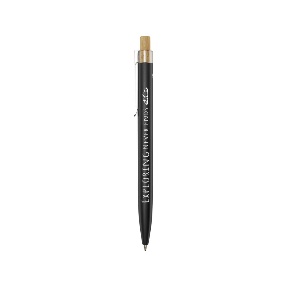 Шариковая ручка Nooshin изготовлена из переработанного алюминия, что требует меньше энергии, чем производство алюминия из сырья. Это также уменьшает количество отходов на свалках и помогает сохранять природные ресурсы для сокращения выбросов парниковых газов. Нажимная кнопка изготовлена из бамбука. Цвет чернил: синий. Длина непрерывной линии: 800 метров. Размер пера: 1,00 мм. Recycled Aluminium.