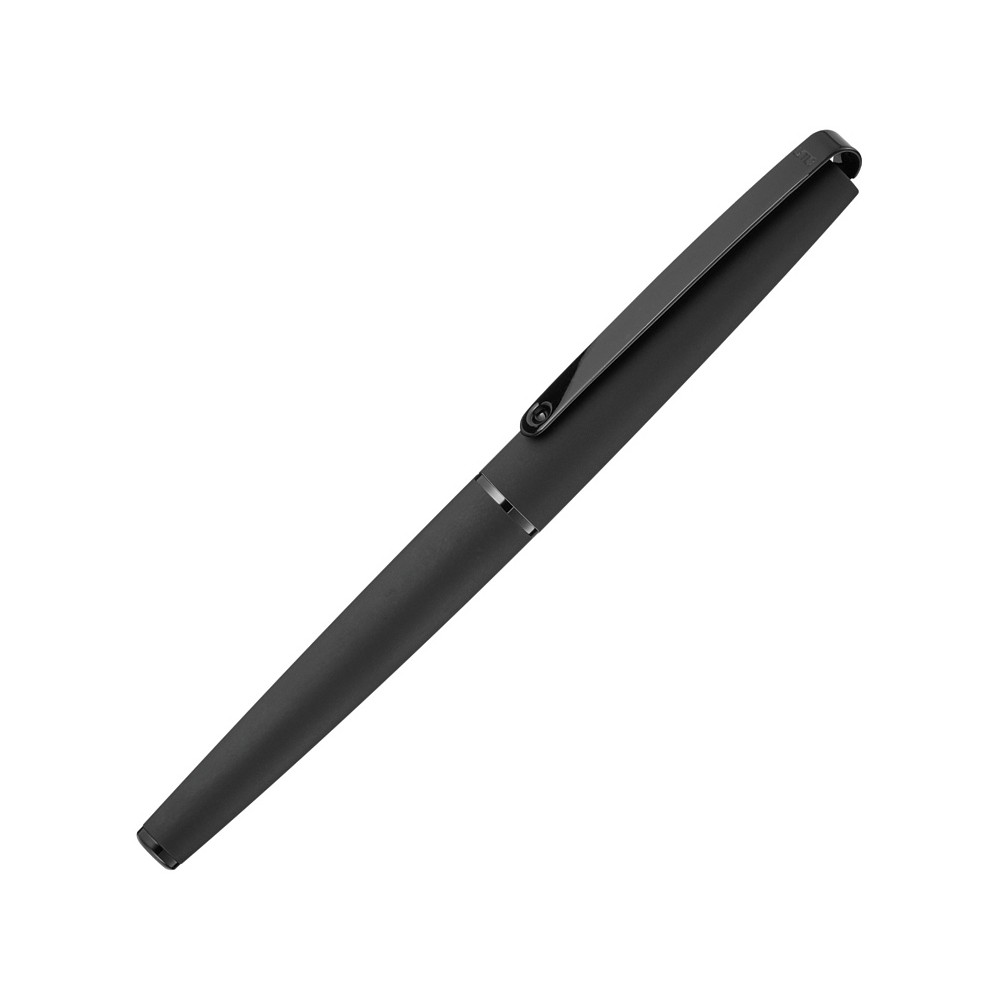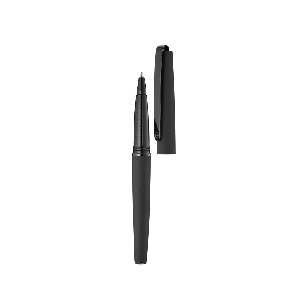 Металлическая ручка-роллер с матовым лакированным корпусом, длинным гибким металлическим клипом, декоративным кольцом и заглушкой с глянцевой отделкой в черном цвете. Рифленая зона захвата с глянцевой отделкой черного цвета.