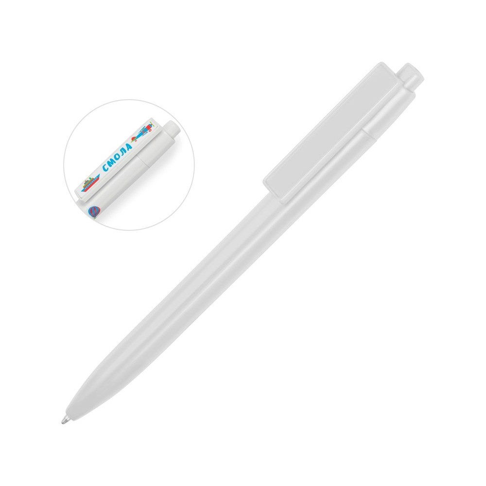 Пластиковая ручка, дизайн клипа которой разработан специально для персонализации в виде заливки смолой. Ручка с этим видом нанесения смотрится особенно эффектно благодаря объемной форме и глянцевому блеску.