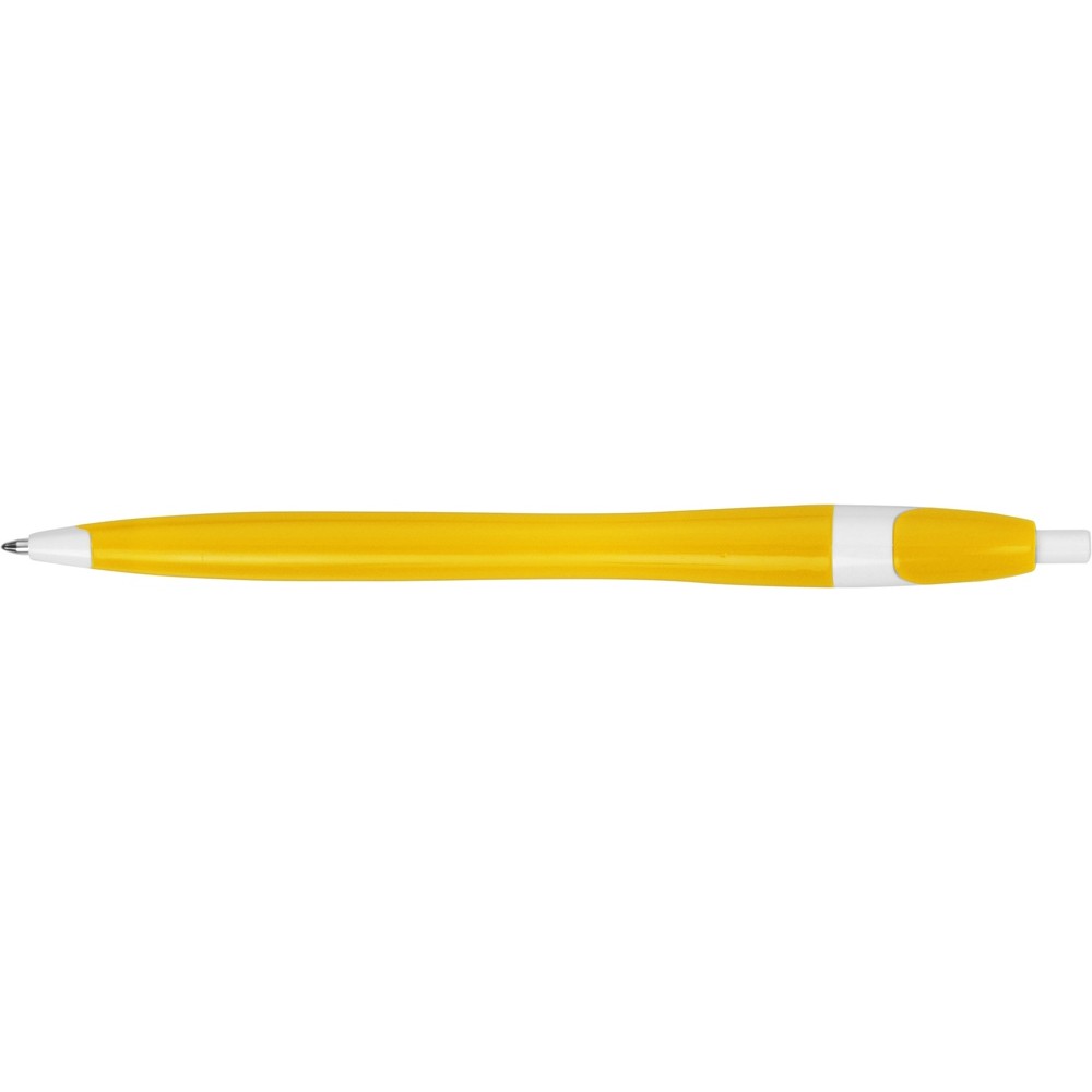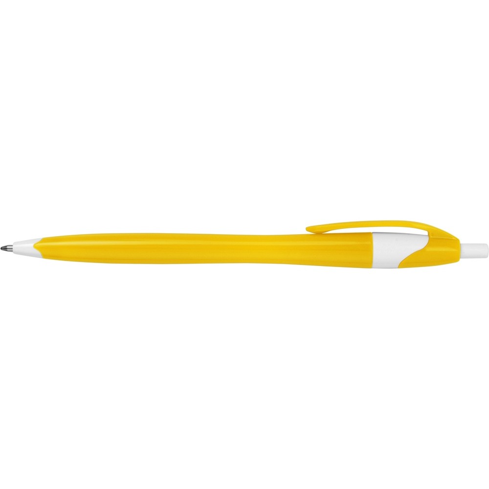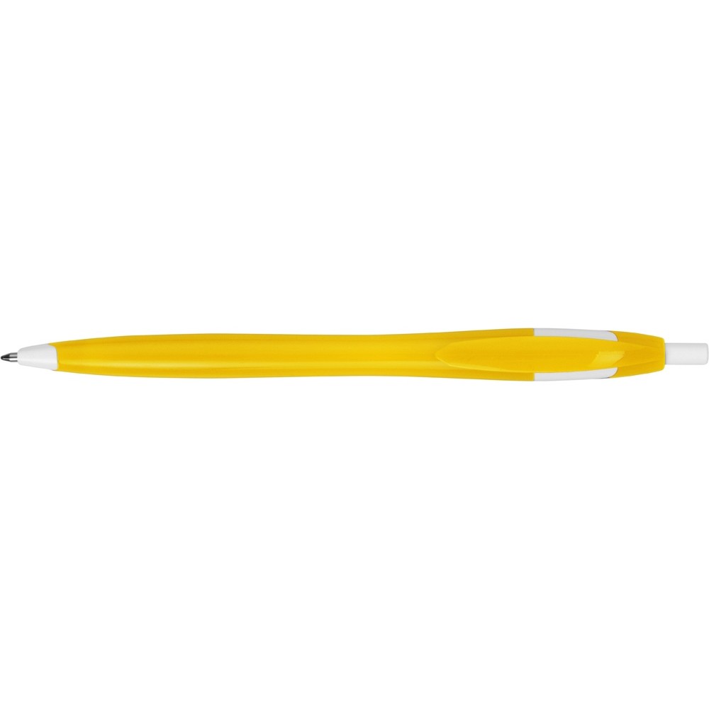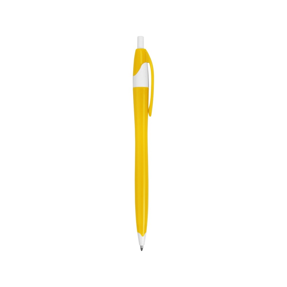 Простая, но стильная пластиковая ручка с цветным корпусом и белыми вставками на носике, кнопке и под клипом. Белые вставки делают ручку более заметной, не отвлекая от рекламной информации на ее корпусе.