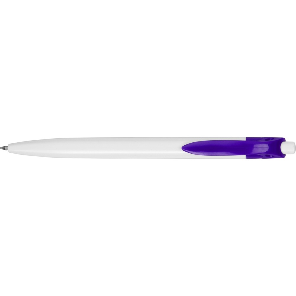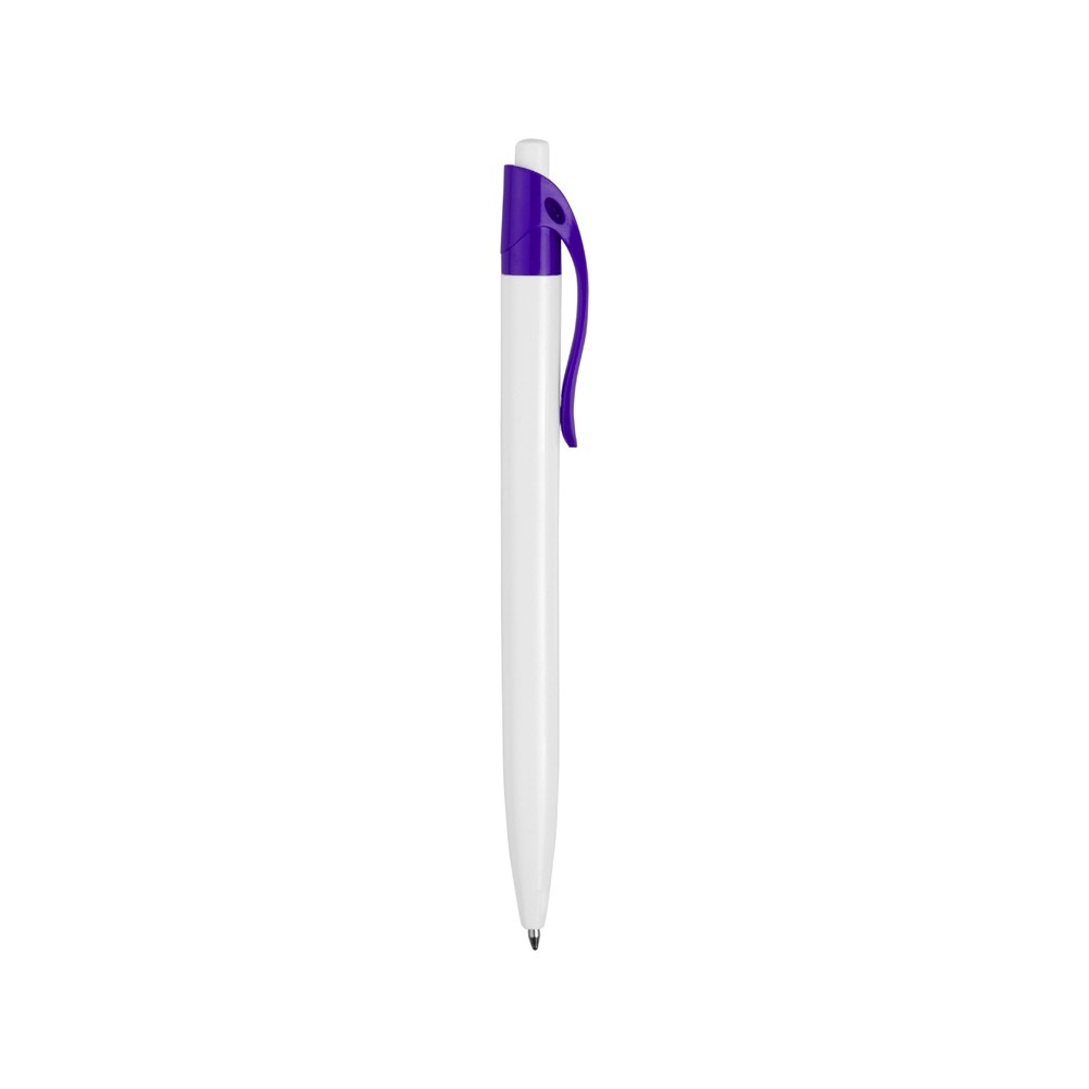Стильная пластиковая ручка с ярким цветным клипом и белым корпусом отлично подойдет для нанесения логотипов и рекламной информации.